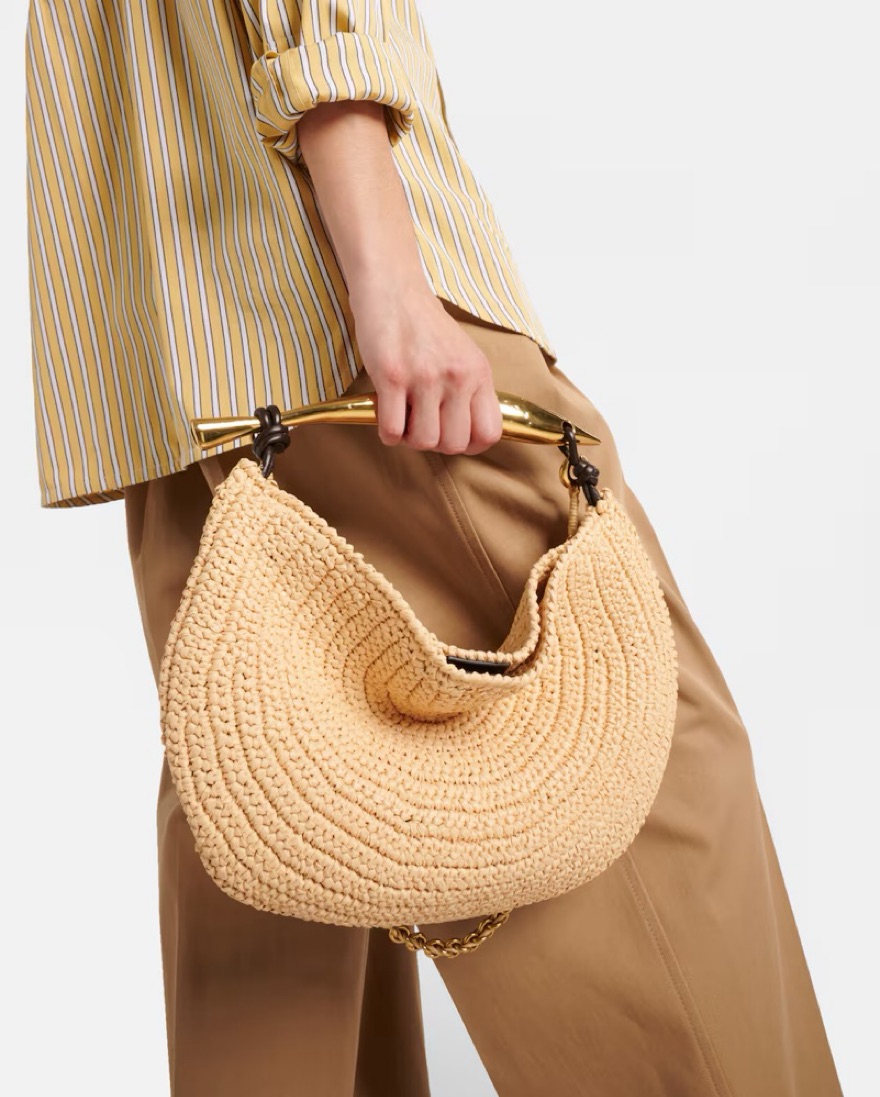 Celeb loved raffia crochet it bag with sculptural metallic top handle and tubular leather braided metal chain. The metallic handle is crafted by artisans and showcases nuances and engraved markings making each piece unique.
