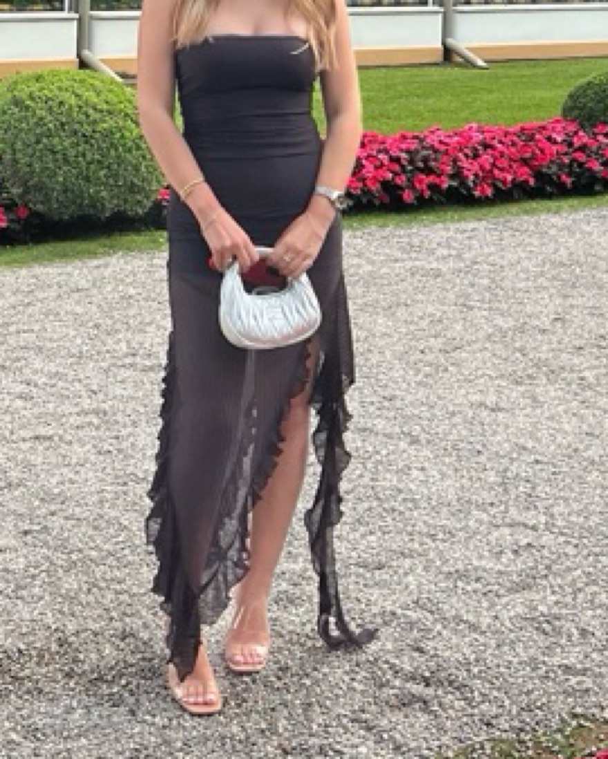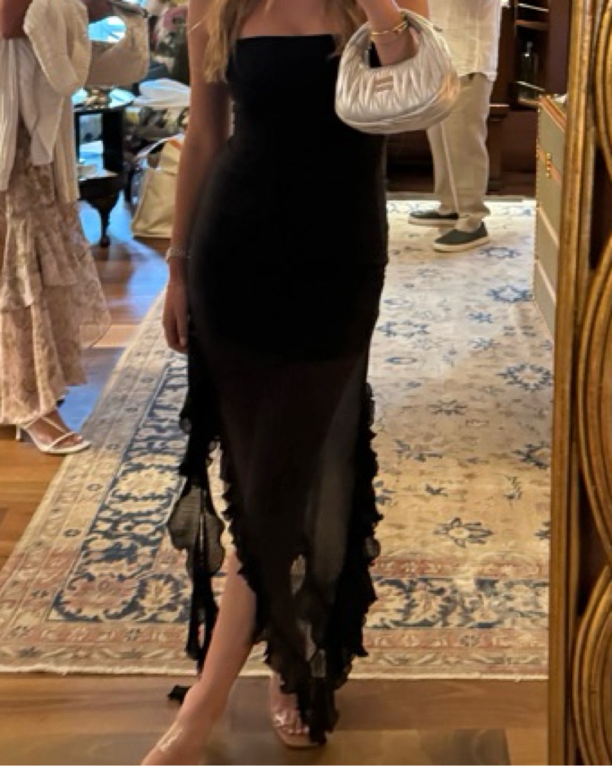 This stunning maxi dress is perfect for a formal event or special occasion. The flowing ruffled skirt and off-the-shoulder silhouette create a beautiful, feminine look.