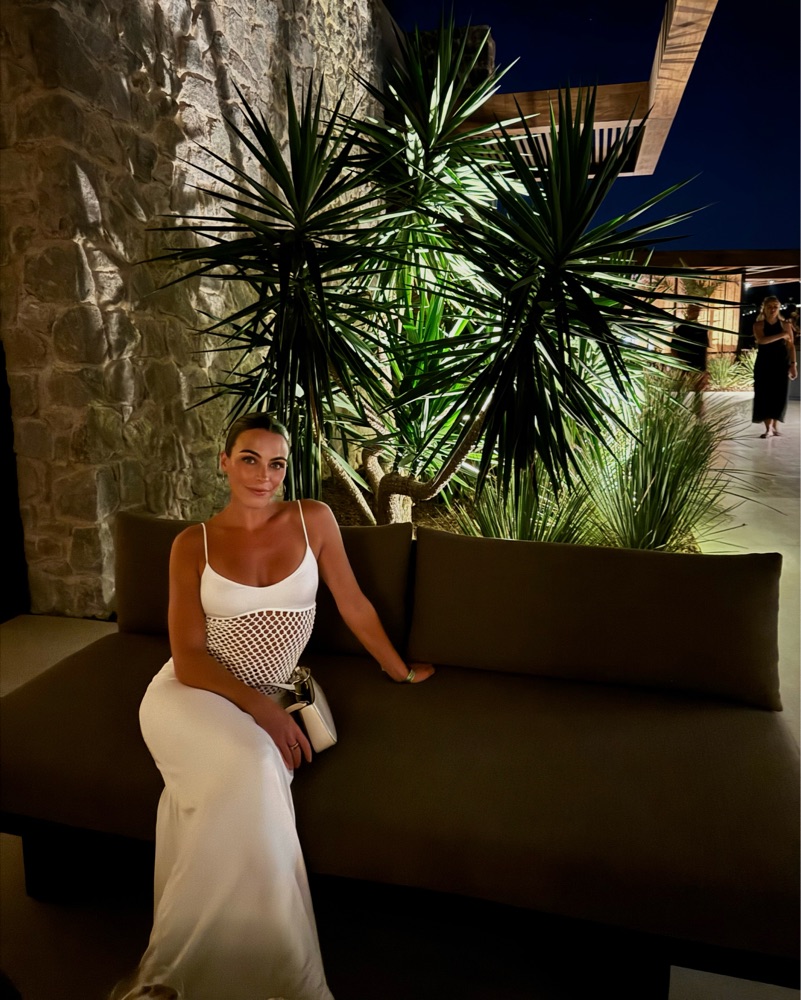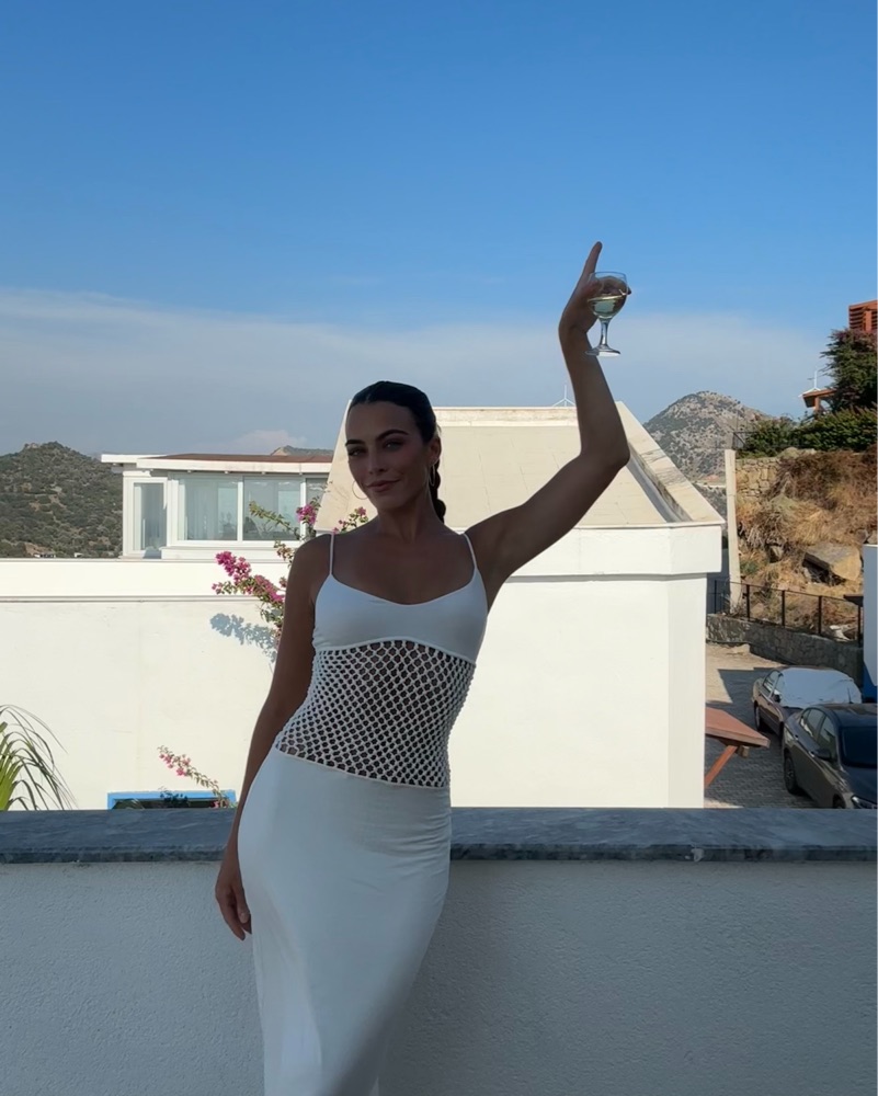 This elegant white maxi dress with a mesh cutout panel is perfect for a summer soiree or special occasion. The sleek silhouette and bohemian-inspired pendant necklace create a chic, effortless look.
