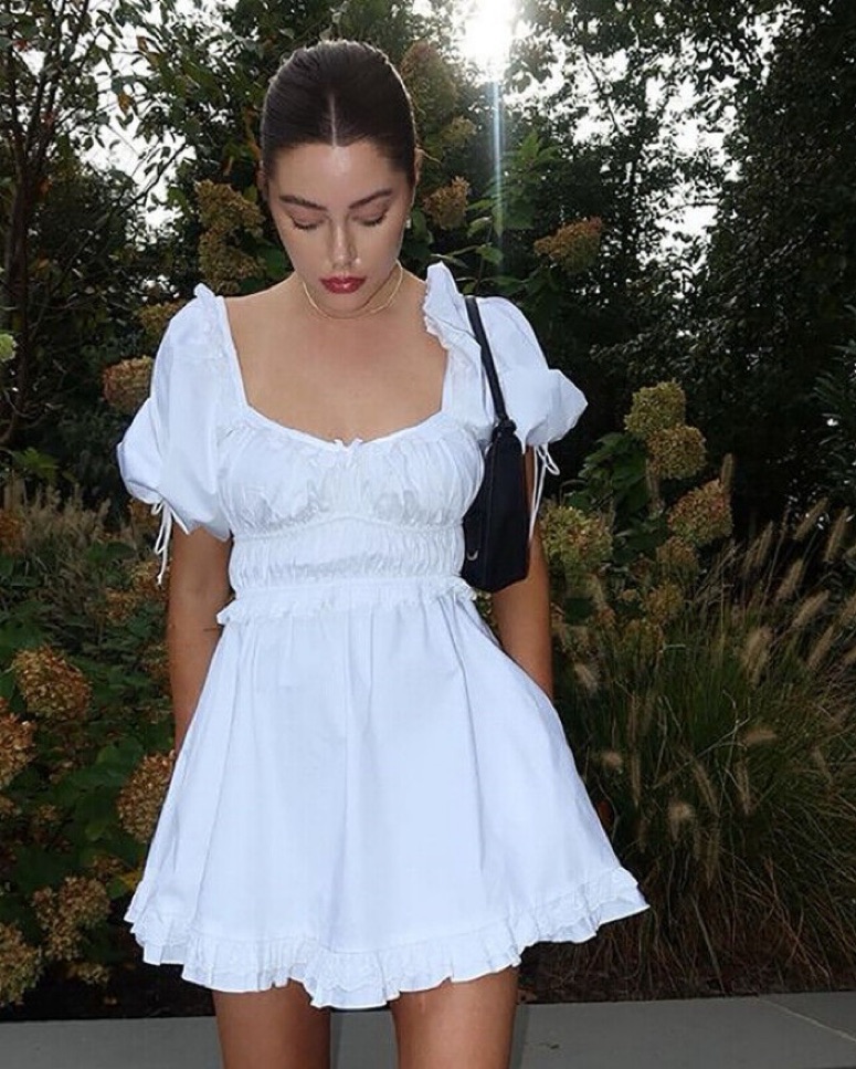 Vintage inspired cotton poplin mini dress featuring delicate eyelet trim throughout. Shirred bodice, puff sleeves, and side seam hidden pockets. Fit and flare silhouette.