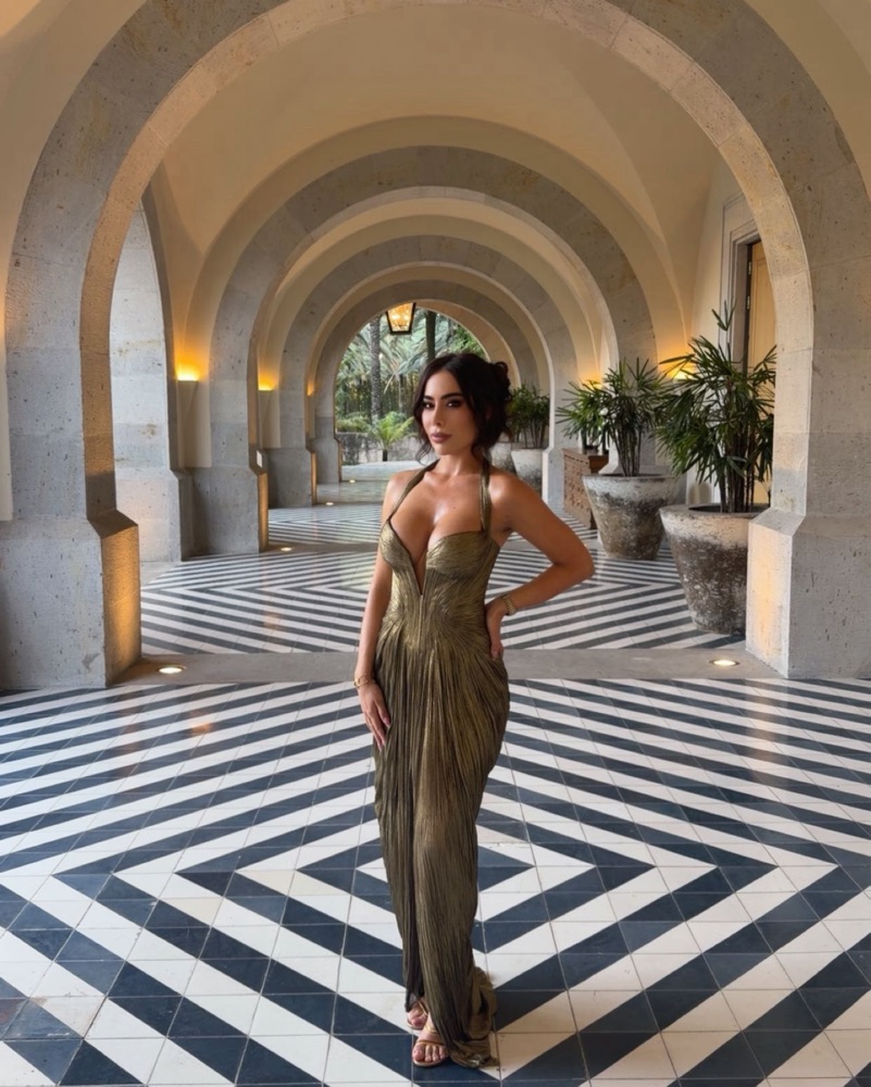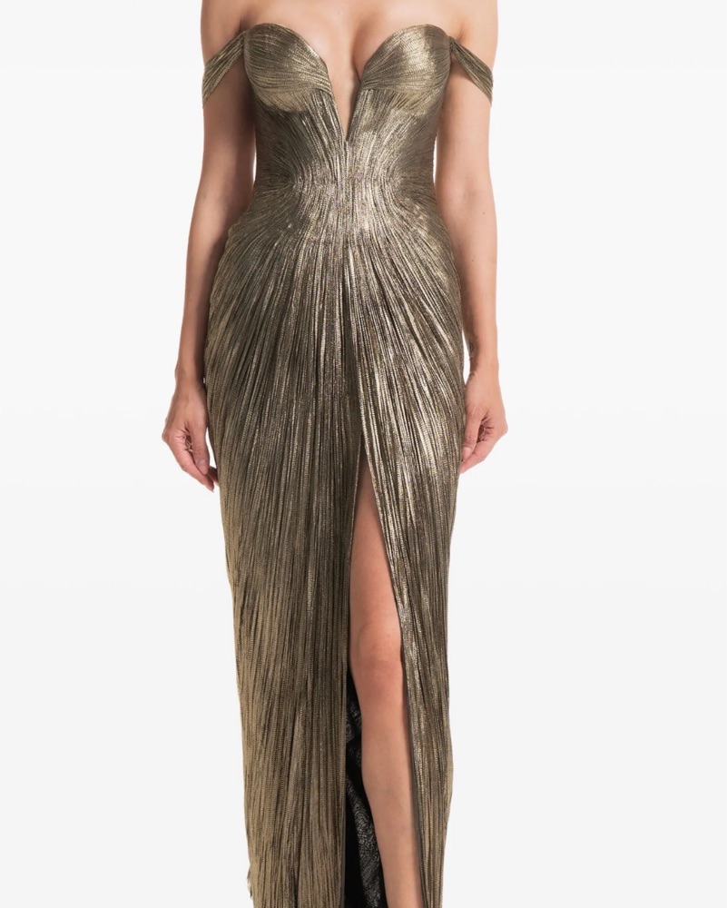 Worn once ! Customized to a halter for a tighter fit . Size 36 (small ) gold tone pleated beautiful fitted dress. Professional dry cleaning is required before return.