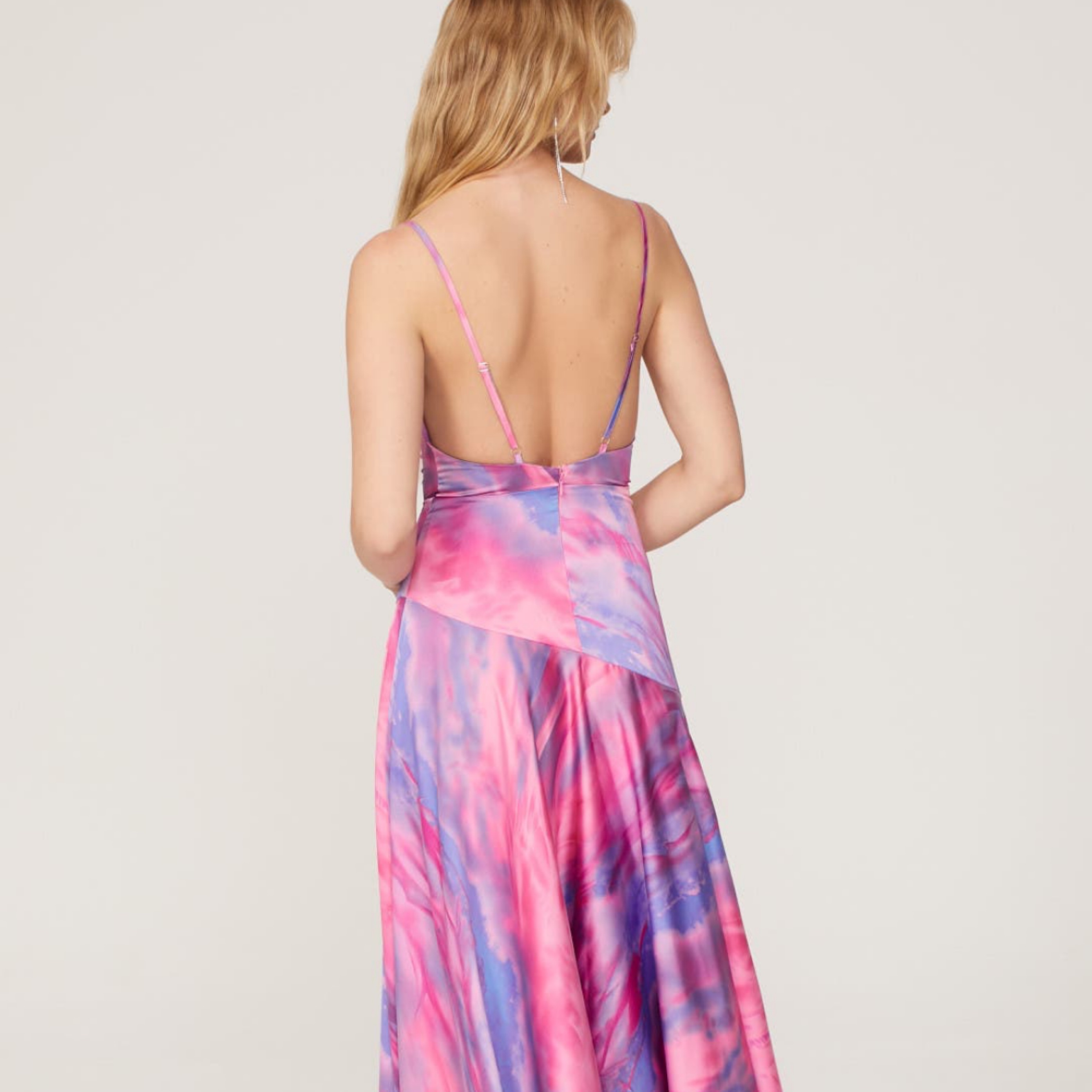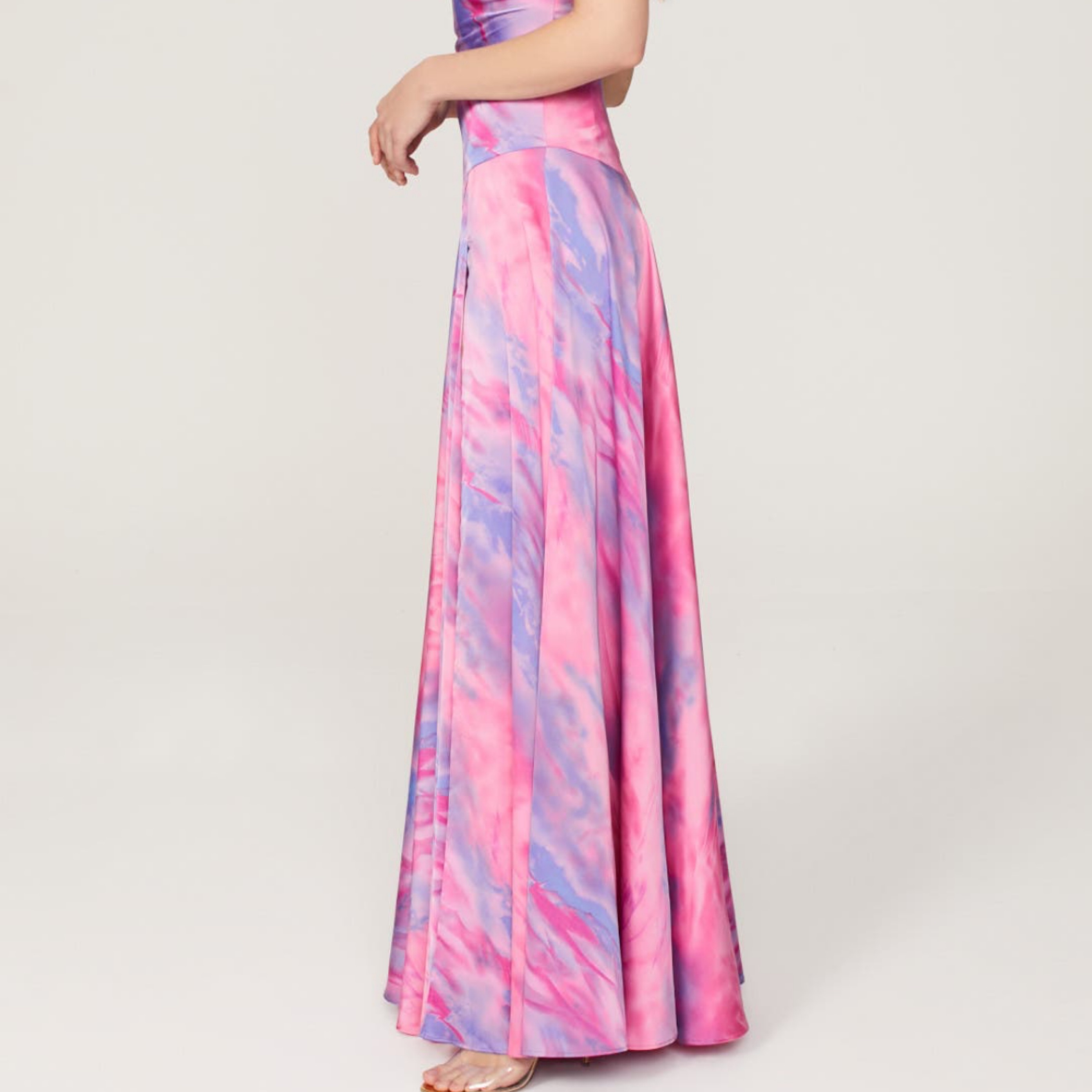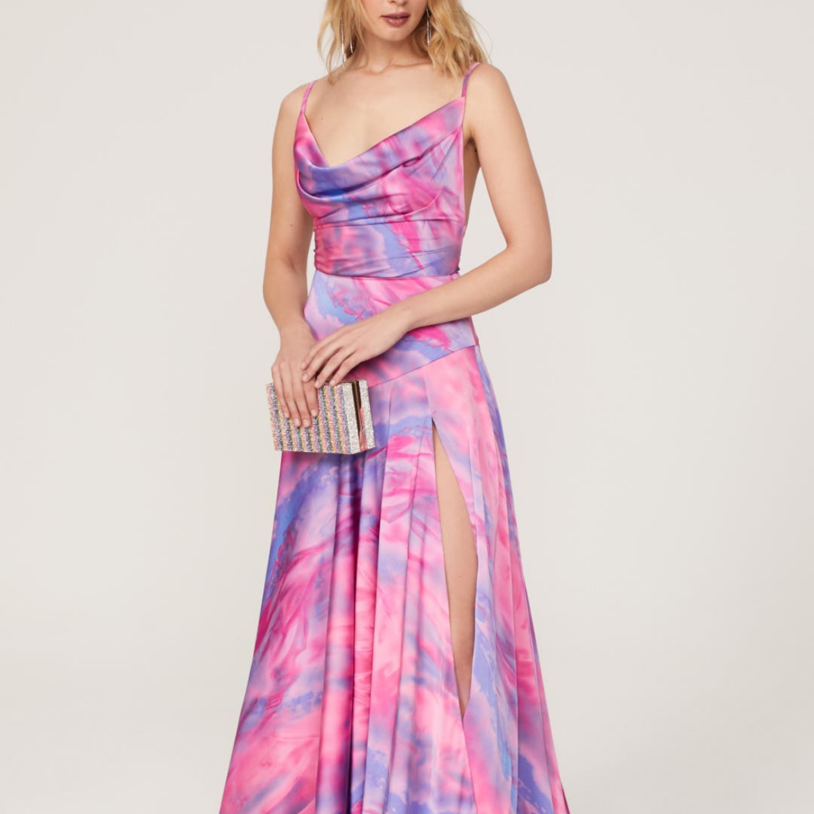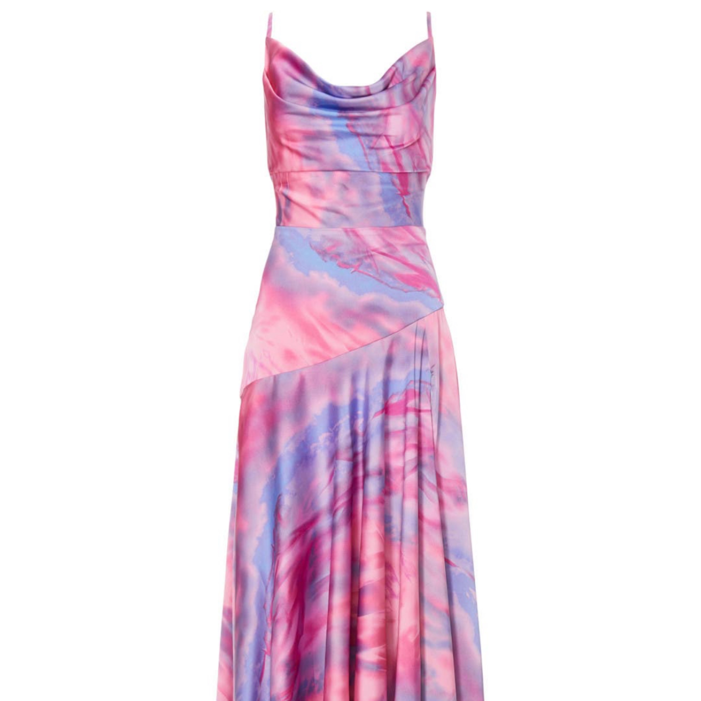 Flirty cowl neck and sly thigh high slit bring sexy allure to this tie-dye inspired gown. 🩷💜🩷was perfect for Eras tour, London!