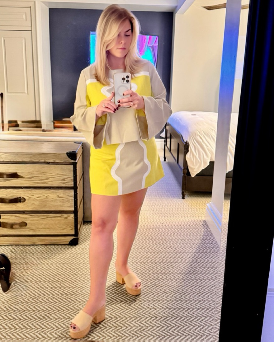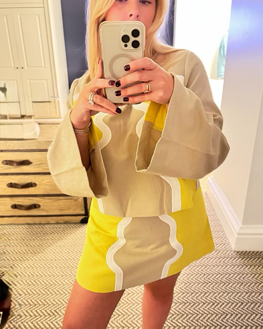 This stylish colorblock set with fun wavy patterns is perfect for a night out or for vacation. Top is large and so is skirt but u would say it runs small and would work for size 6-8.
