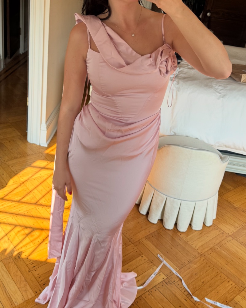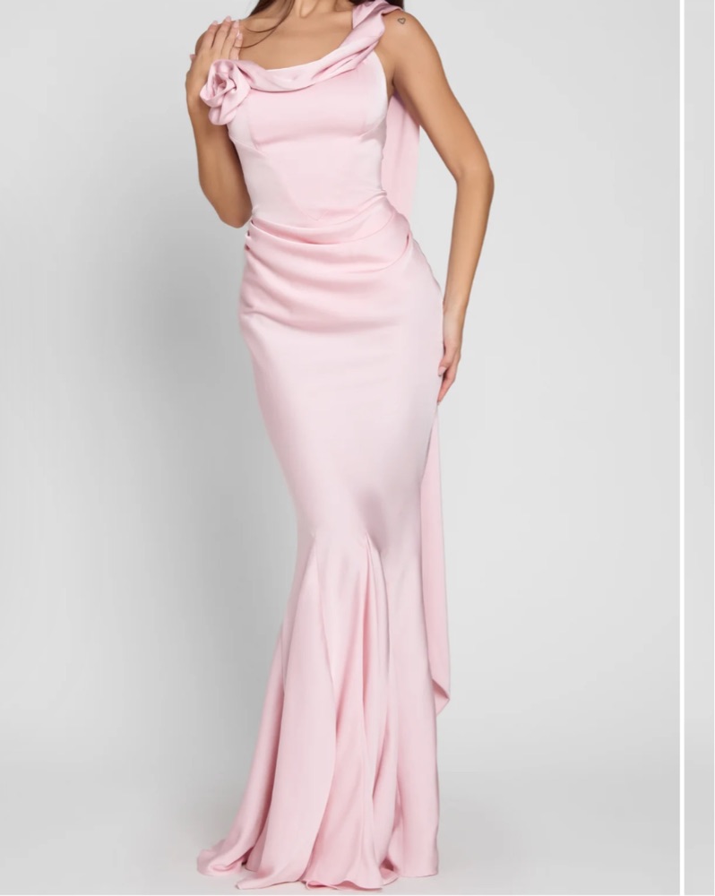 Hasn’t been worn yet! pink satin gown with corset waistline, draping detail and slightly flared hemline. The right shoulder features a rosette detail while the other is complimented with a longer draped scarf.