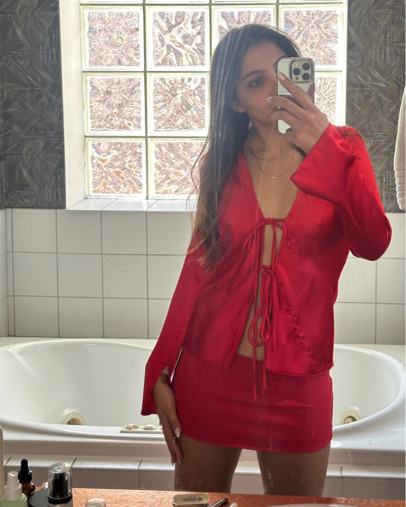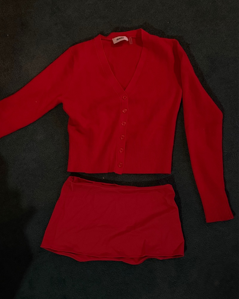Danielle Guizio red micro mini stretch skirt that hugs in all the right places. Pair it with the red v sweater for the CUTEST set. Perfect for vacation days, bachelorettes, concerts, or girls’ nights. Easy to mis and match as well for multiple looks!