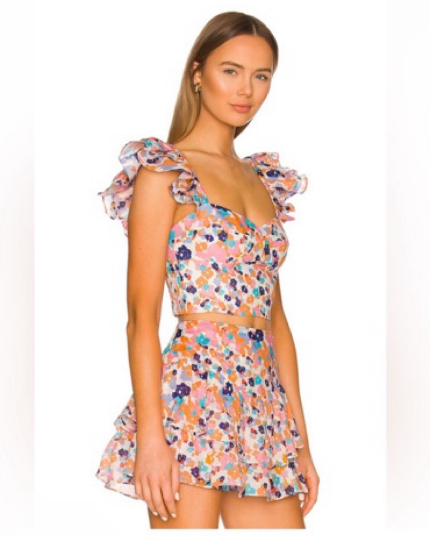 PERFECT spring/summer top - this is one of my all time faves!! Adorable floral print in fun colors, feminine ruffled shoulder straps and superrr flattering cut for the girls. Looks amazing with a white skirt or pants!
