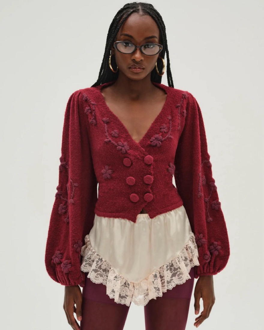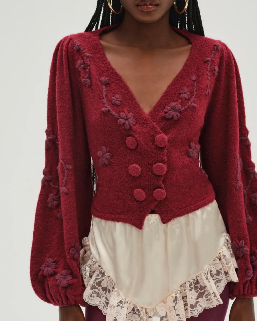 Adalyn burgundy cardigan, embroidered with beautiful florals. Cut to a cropped length with a double-breasted silhouette, this fitted cardigan spotlights long puff sleeves and a tie at the back waist. Unlined, Elastic at wrist, self tie at back waist. Functional buttons in front.