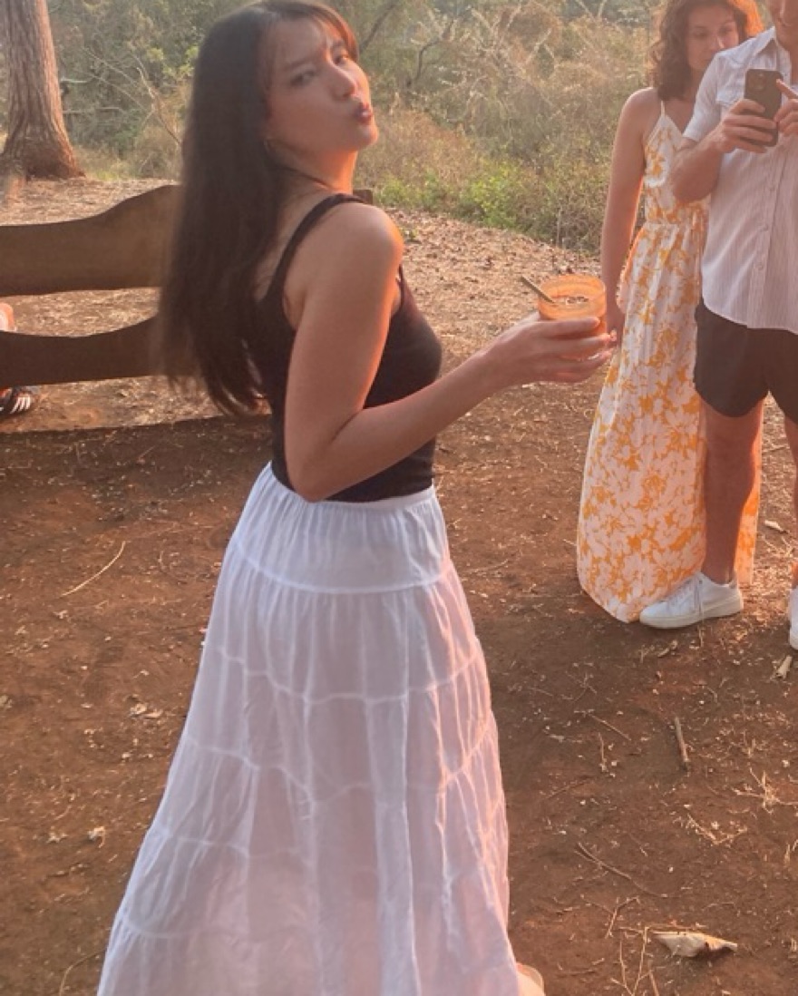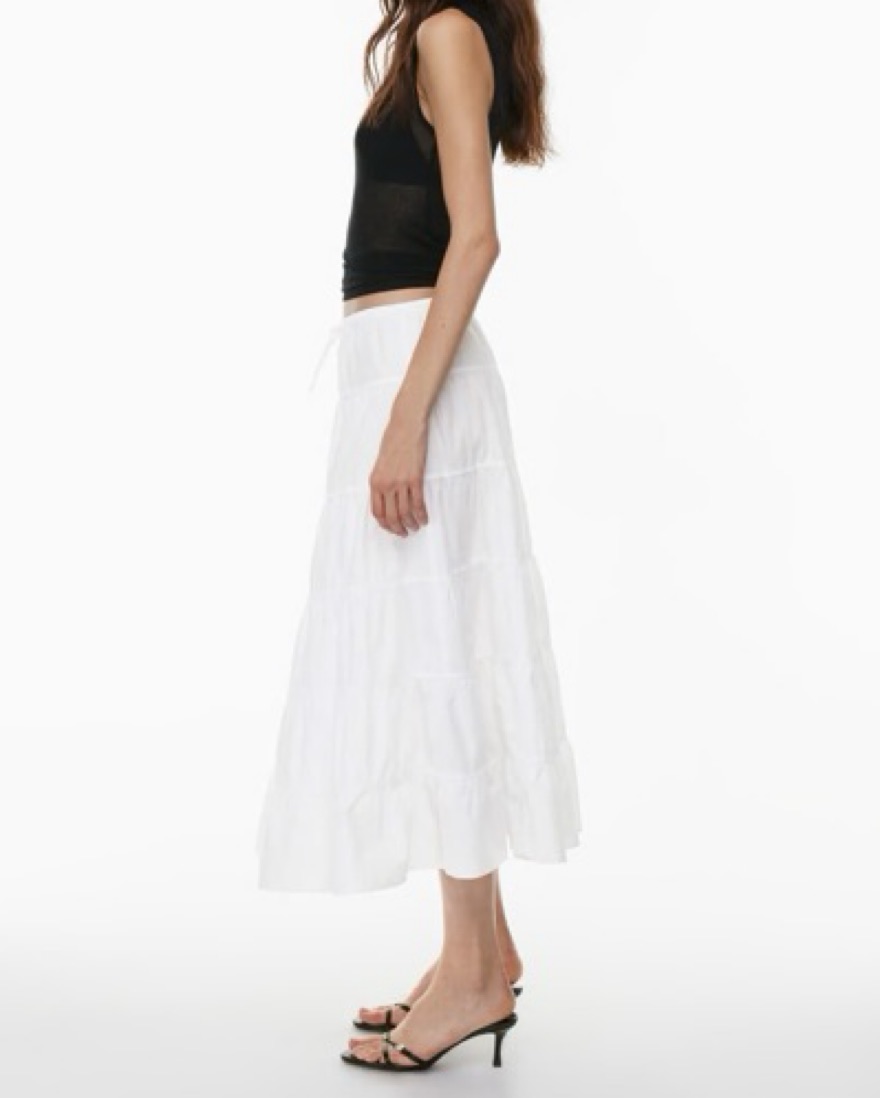 White linen tie midi skirt from Aritzia. High-rise tiered maxi skirt with a drawcord waist. It's cut from lightweight and airy 100% cotton poplin.