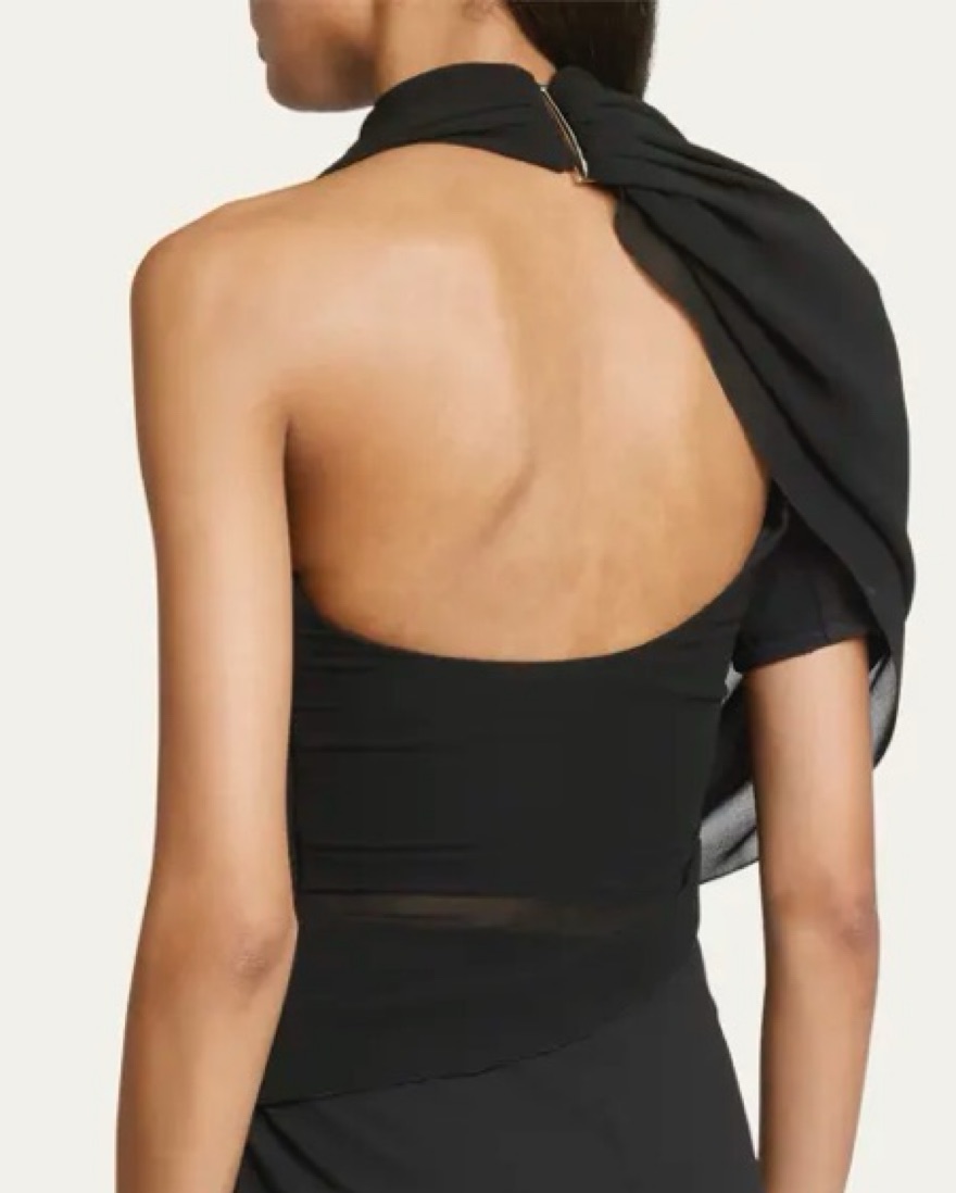 Perfect condition. Worn once. Size FR36/US4. Jacquemus "Le Haut Pablo" one-shoulder draped top High neckline; open back Short sleeve Hip length
