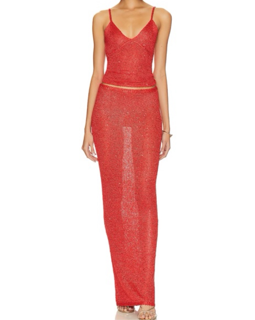 61% polyester, 39% cotton Lightweight open knit fabric with sequin embellishments. small top / medium bottom !!