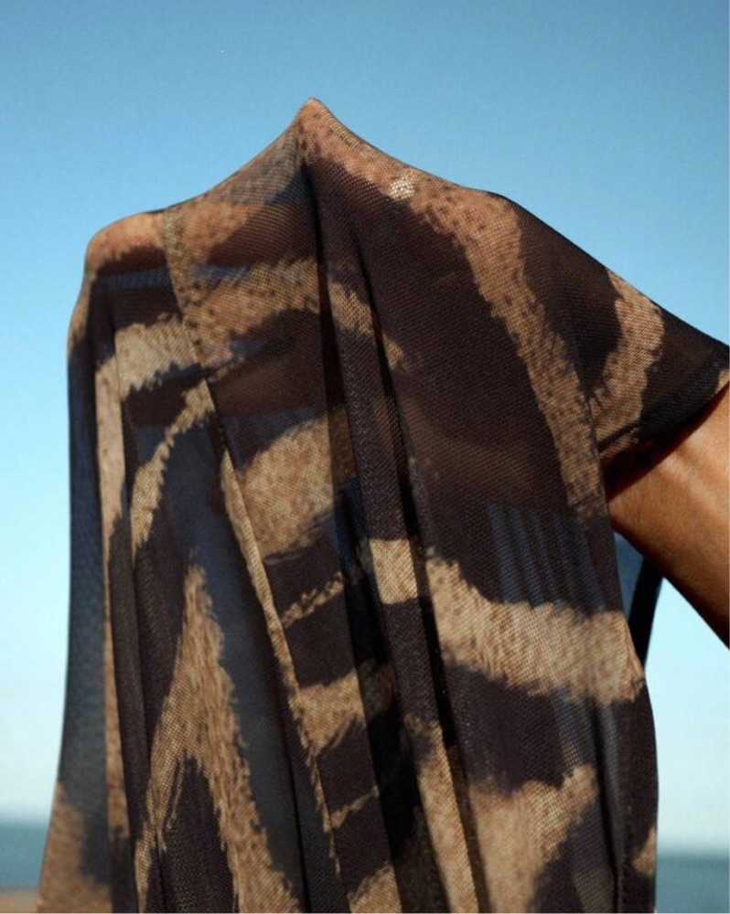 This striking dress with a bold zebra print is perfect for a beach getaway or summer soirée. The flowy, open-back design and high-slit silhouette exude effortless elegance. (Very deep v - I cut out the middle bar)