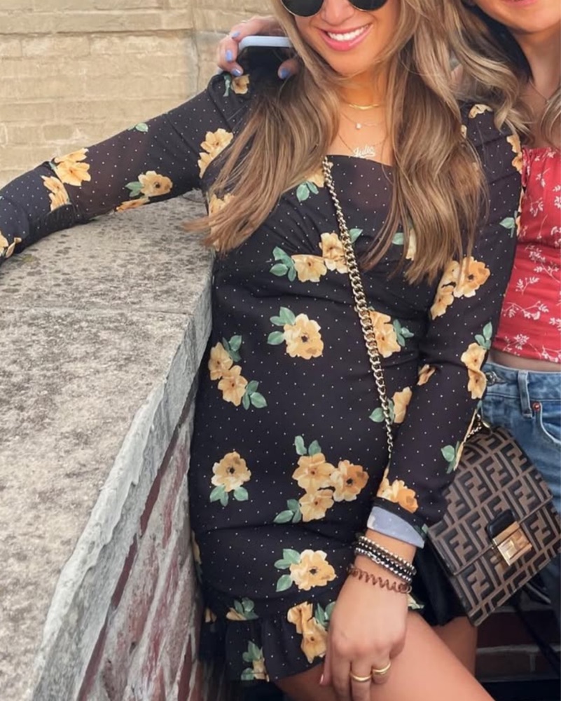 Great condition, long sleeve, square neck mini dress with flower details.