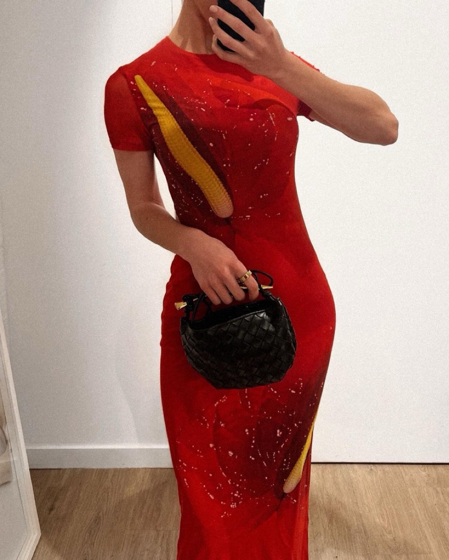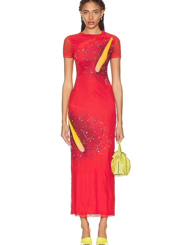 Loewe red mesh dress with floral detail. Super comfortable, can be dressed up or down.