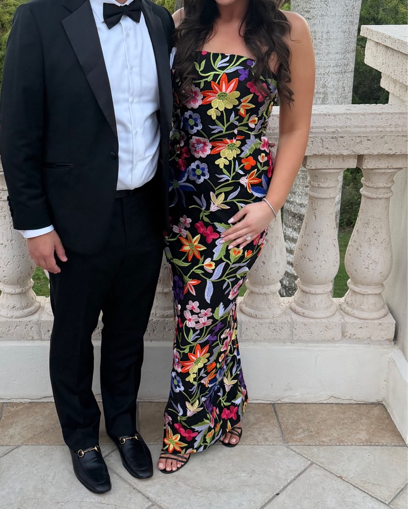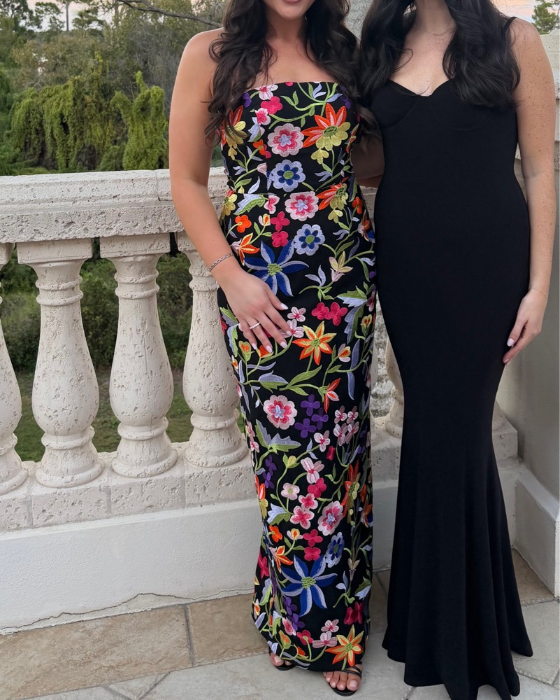 Black dress with multi color embroidered flowers true to size. • Straight neck