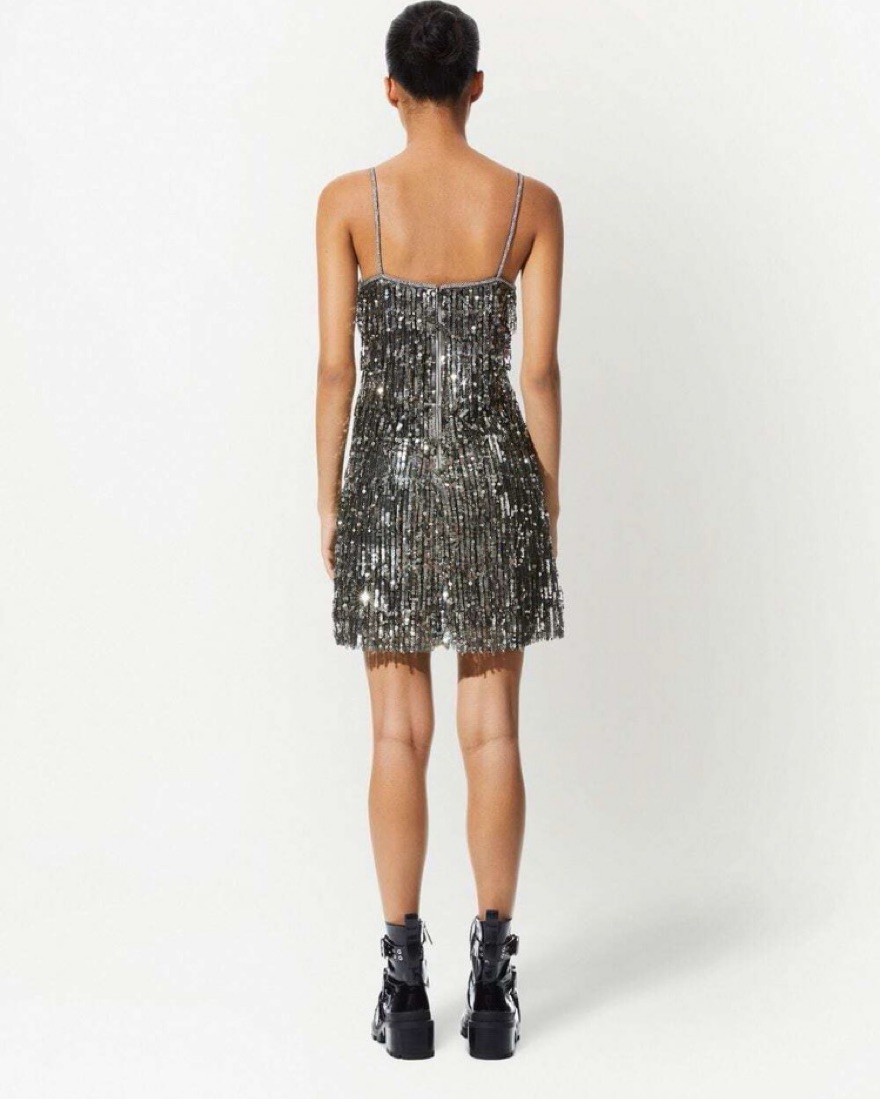 Dazzle in this sparkling sequin slip dress. The sleek silhouette and sparkling embellishments create a show-stopping look perfect for a night out.
