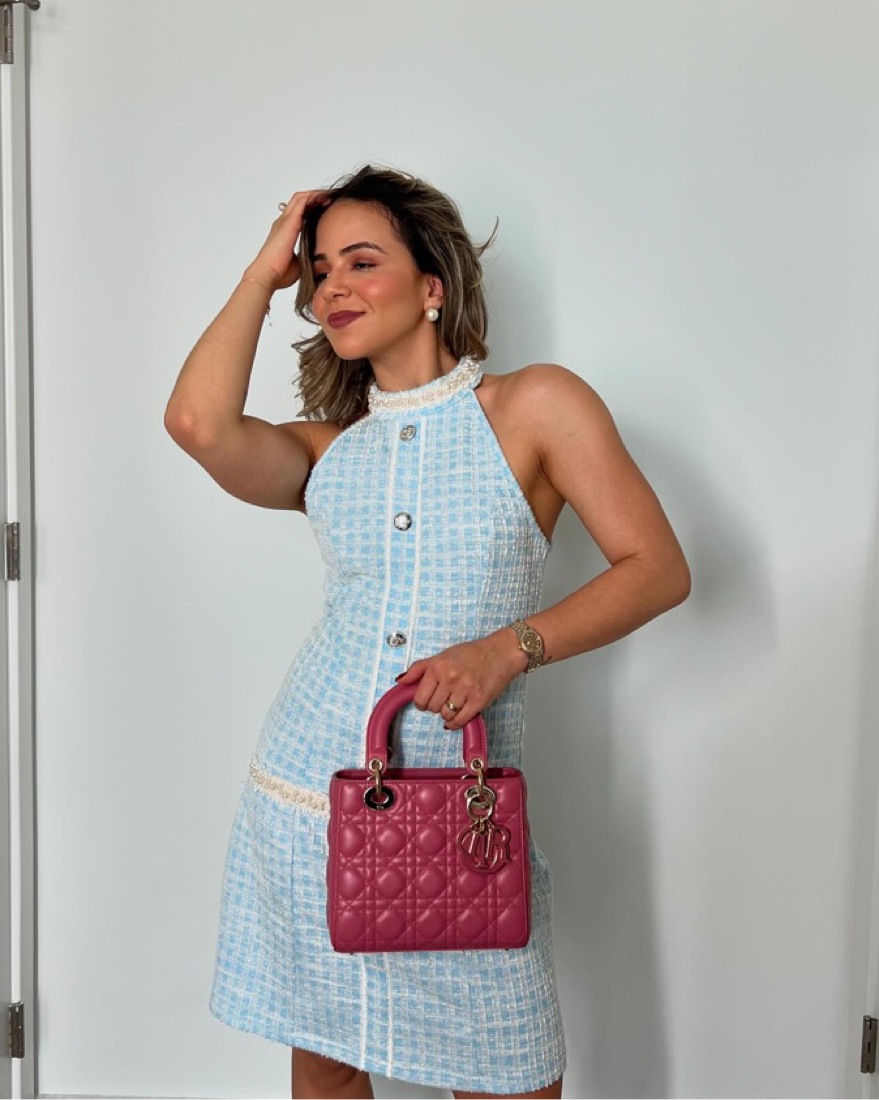 Sophisticated and chic, this blue tweed mini dress features a halter neckline adorned with delicate pearls, exuding timeless elegance. Its Chanel-inspired weave and refined silhouette make it a perfect choice for polished day-to-night looks.