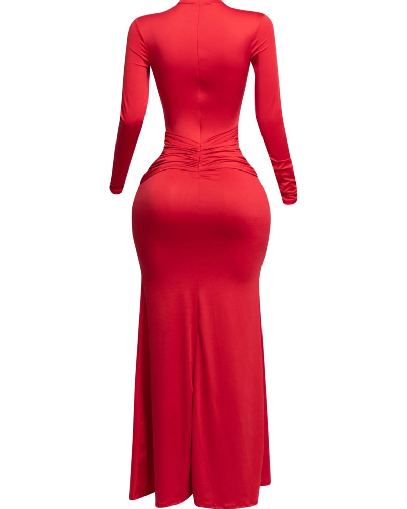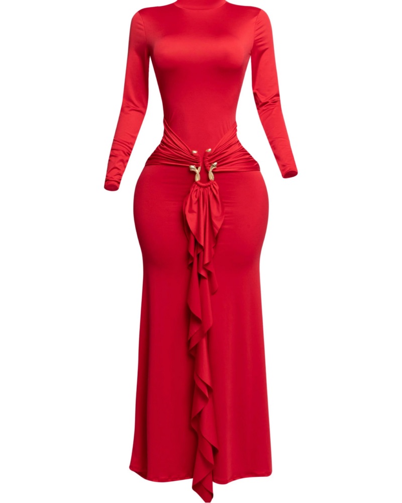 This stunning red maxi dress is perfect for a formal event or special occasion. The floor-length silhouette and ruched detailing create a figure-flattering look. Trimmed detail