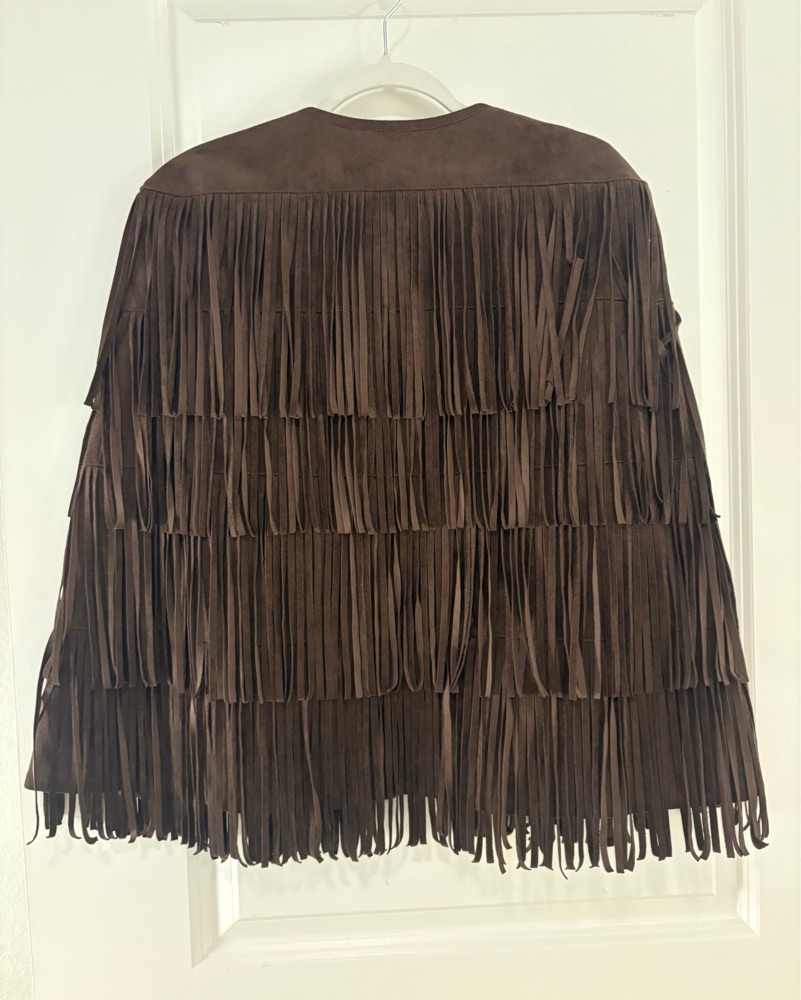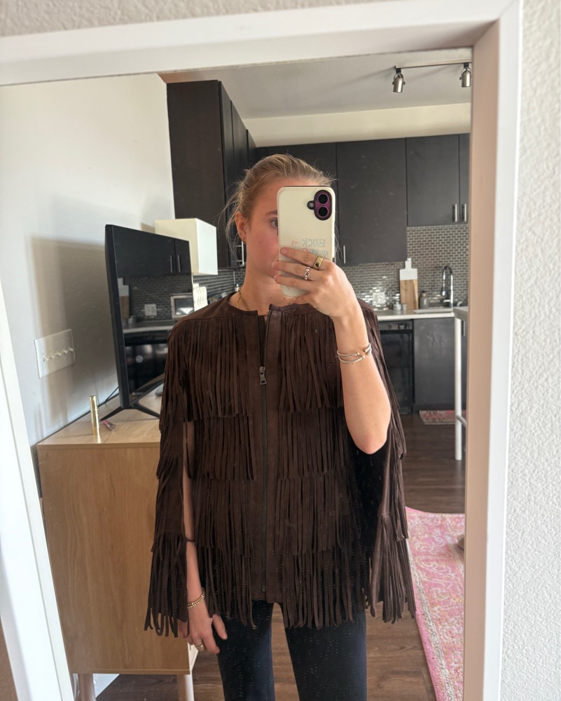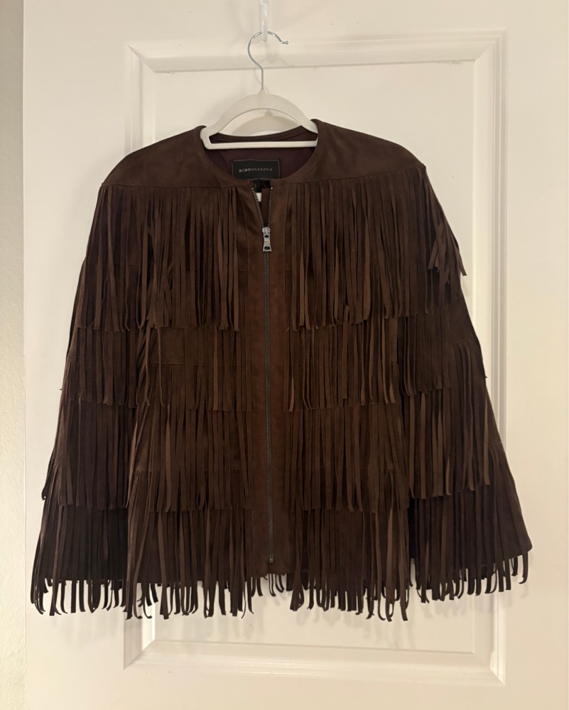 Really cool suede jacket from BCBG. It doesn’t really have sleeves it’s more of a cape. Perfect for a western inspired look or the rodeo