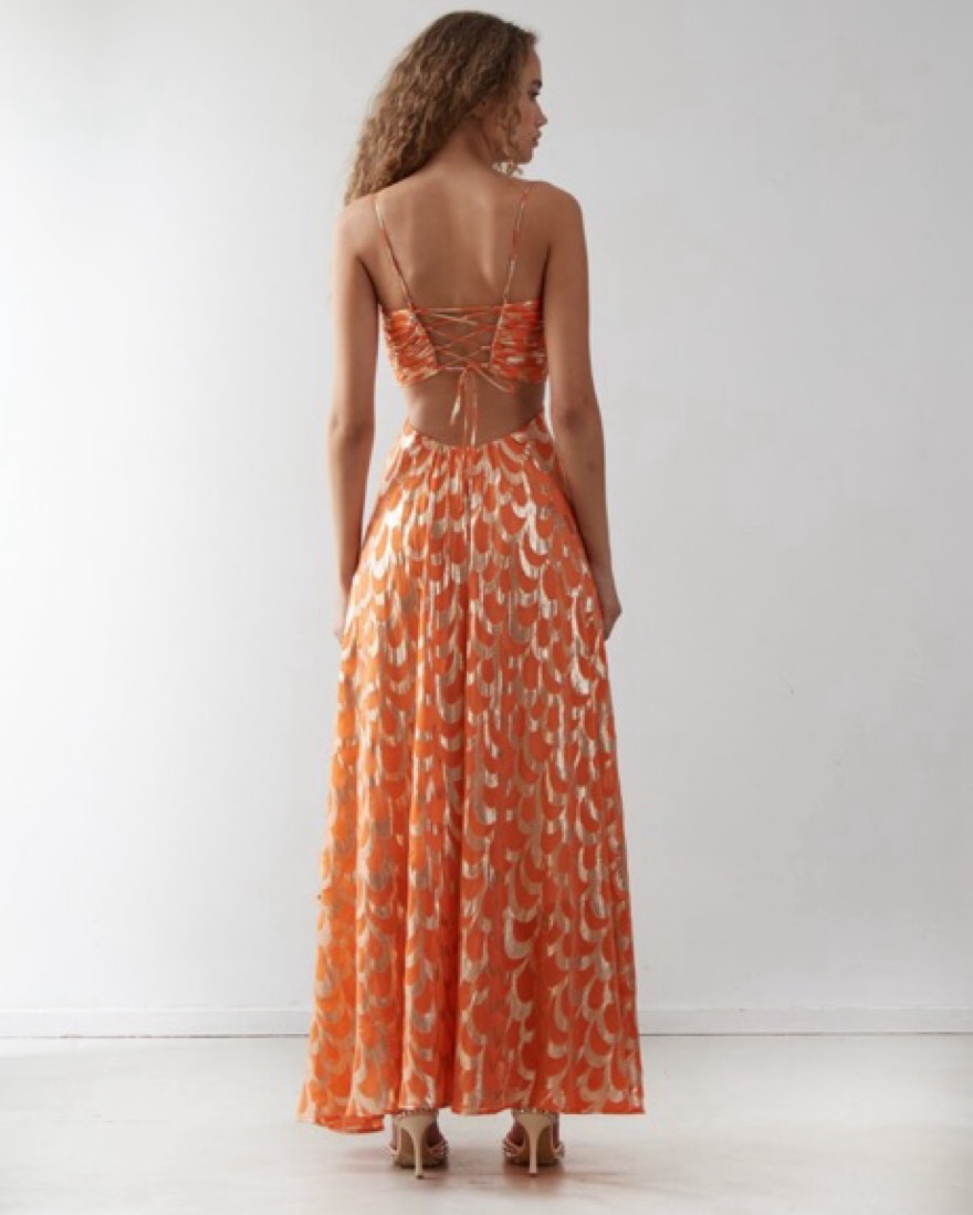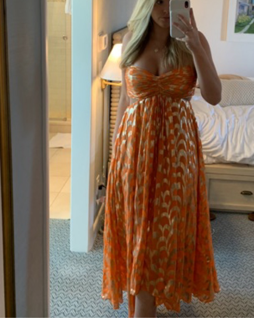 Beautiful orange silk dress with gold details. Location says Scituate but I am now located in Boston, can drop off in either area