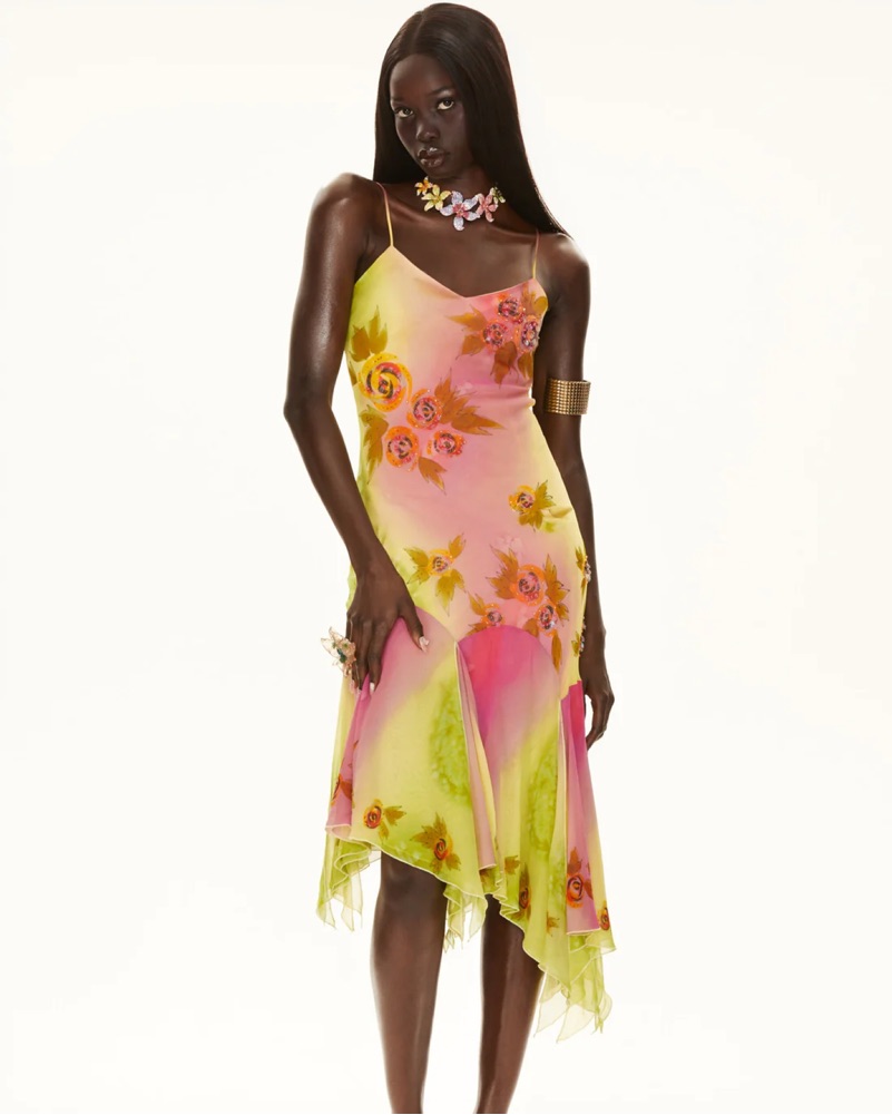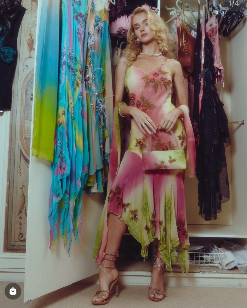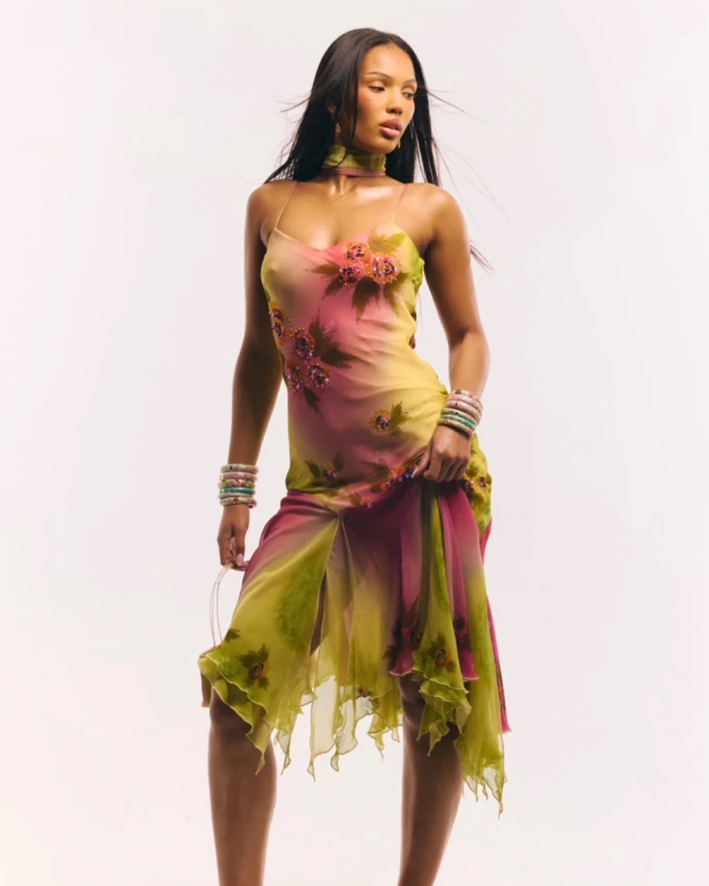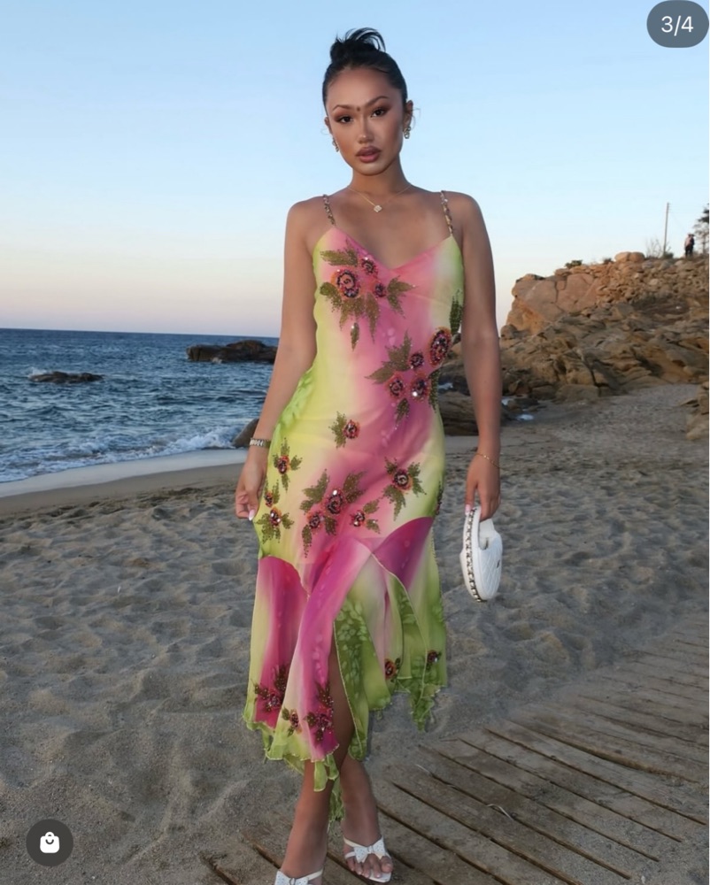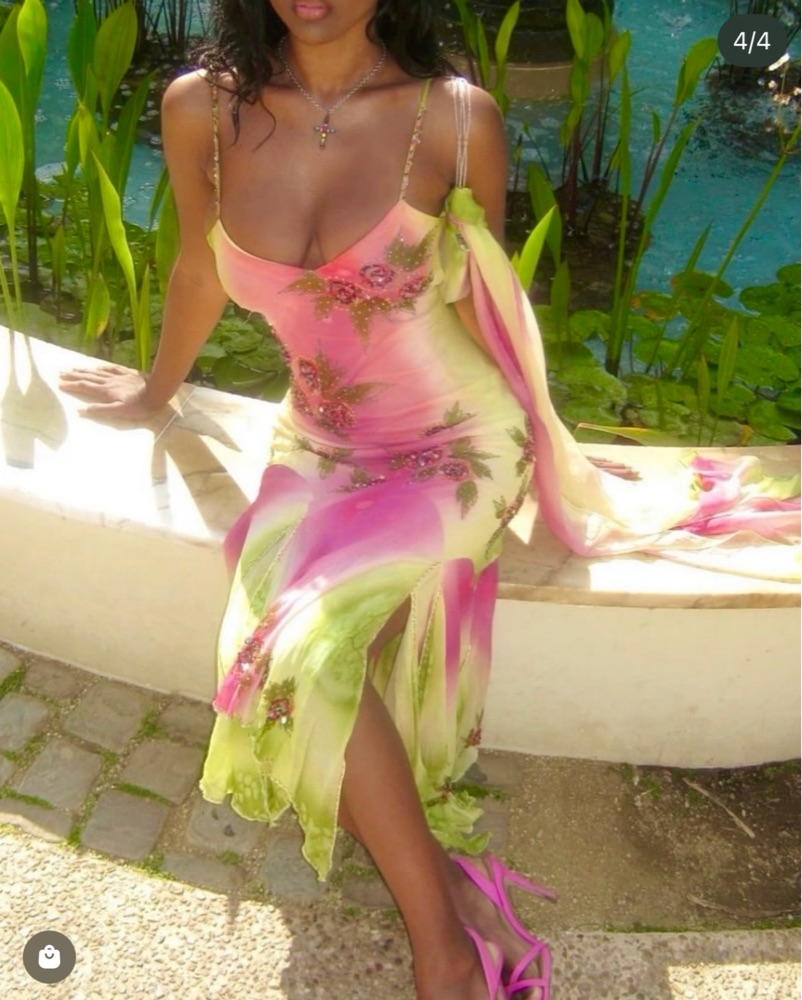 100% silk and hand beaded gown. So flattering and comfortable. Worn once to channel Carrie Bradshaw.
