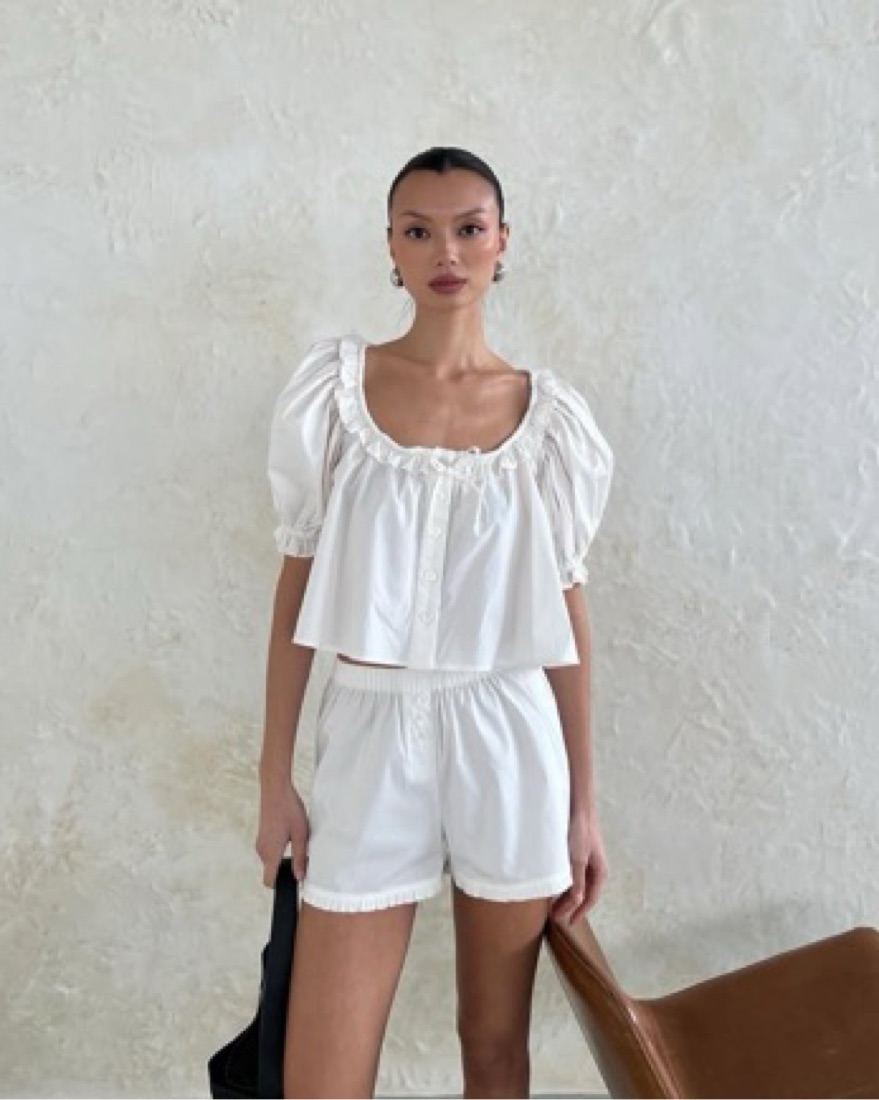 Sold out online! Weworewhat puff sleeve top with ruffle neckline. Would fit Xs-S. Perfect for a summer garden party or elegant evening event.