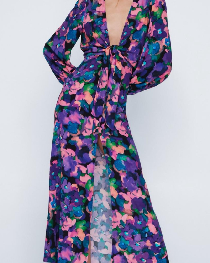 Bright floral knot front long sleeve maxi dress
