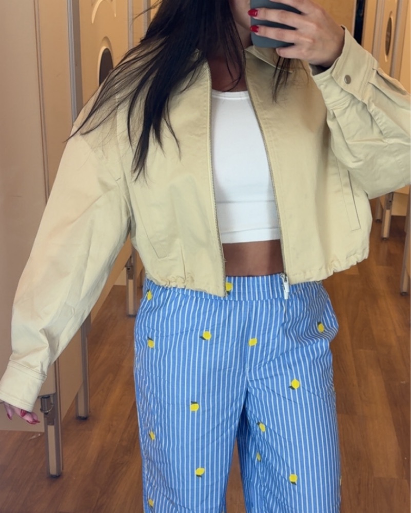 Tan cropped jacket size 4. Dry clean cost included in price. Be careful with makeup on collar!