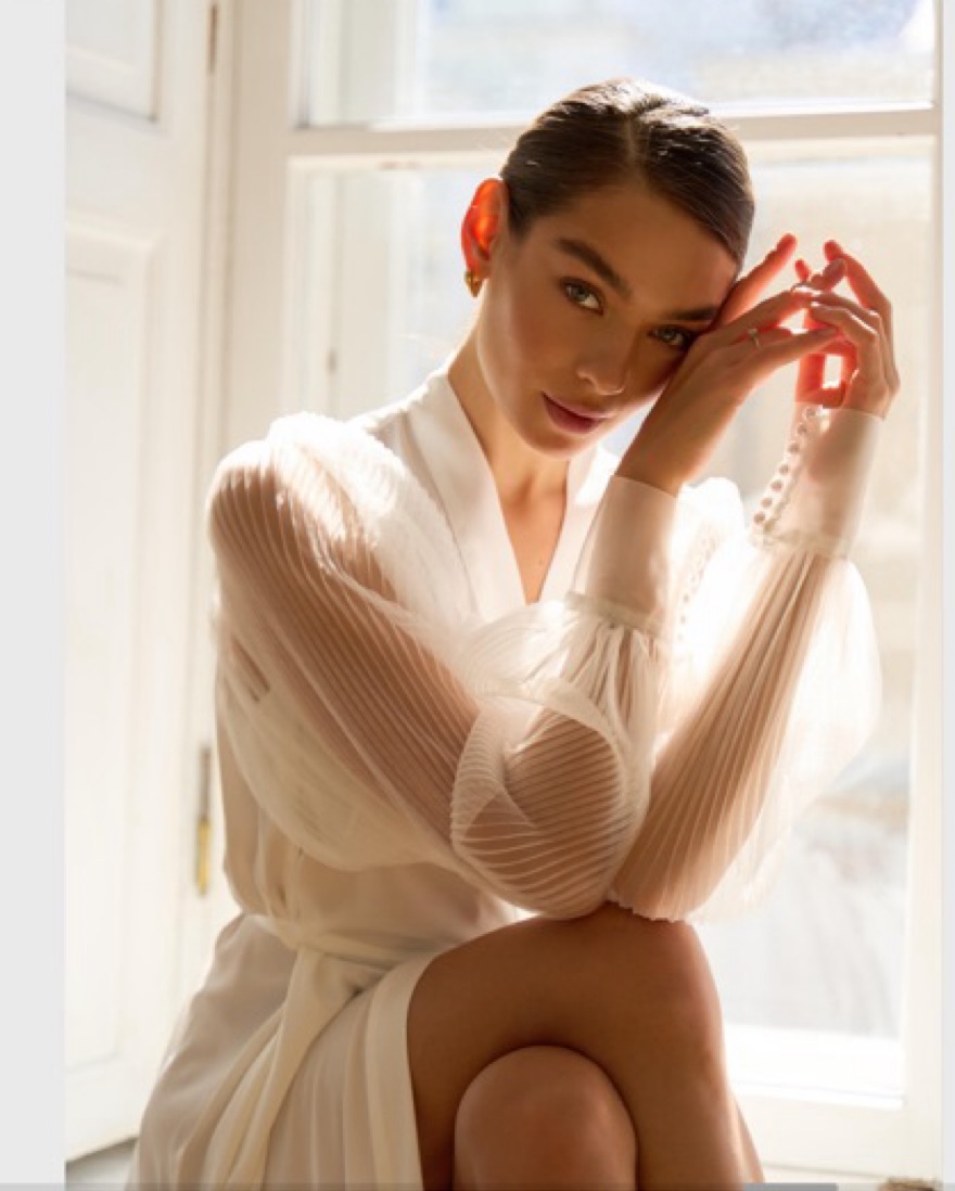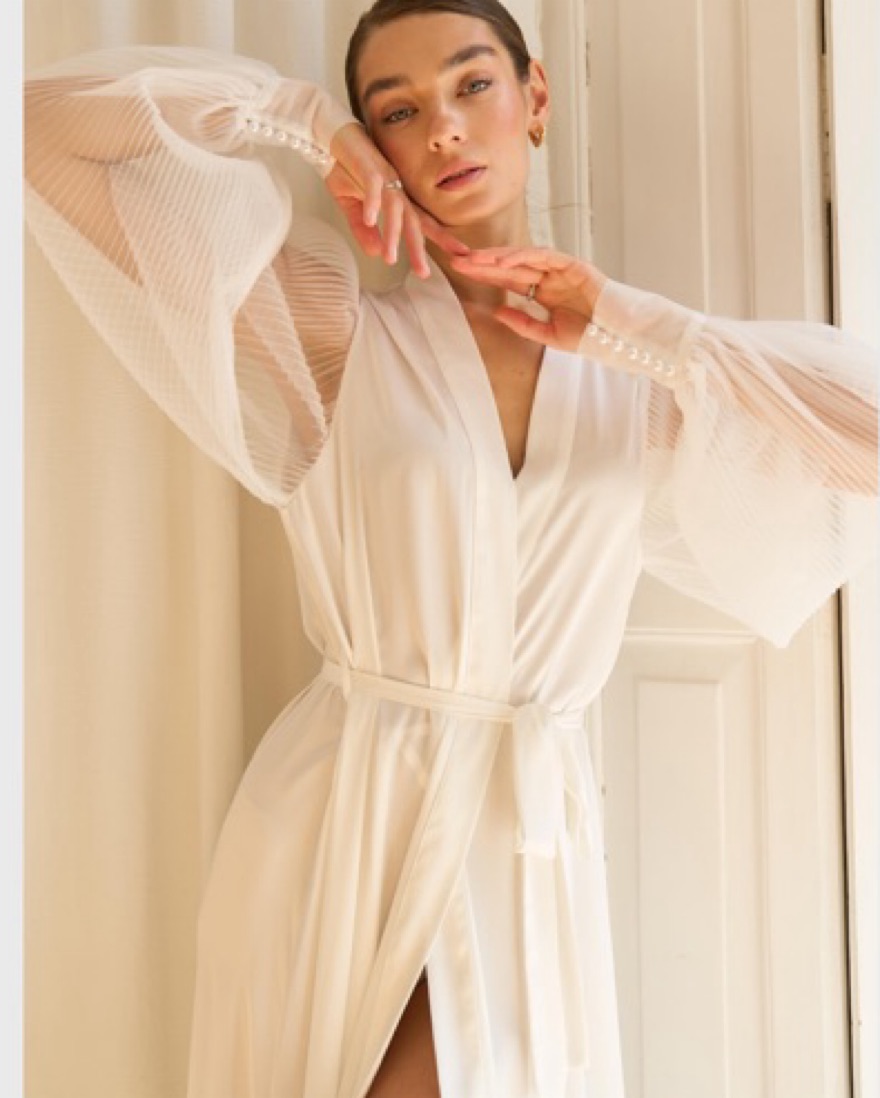 This luxurious ivory pleated maxi robe is perfect for a sophisticated bridal shower or intimate wedding event.