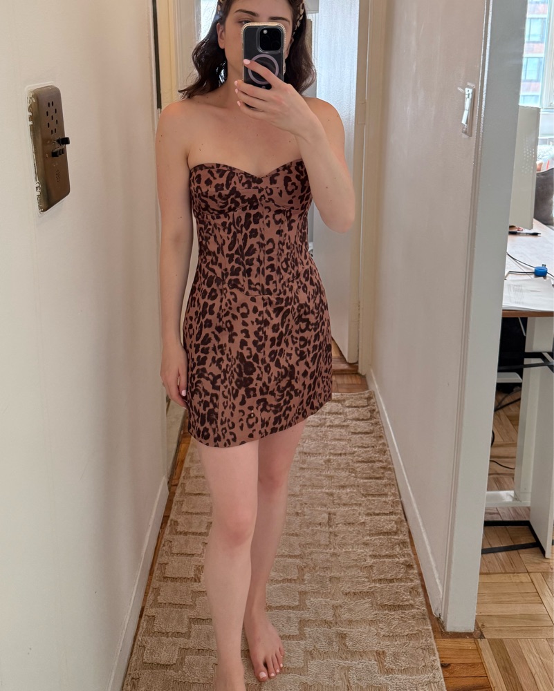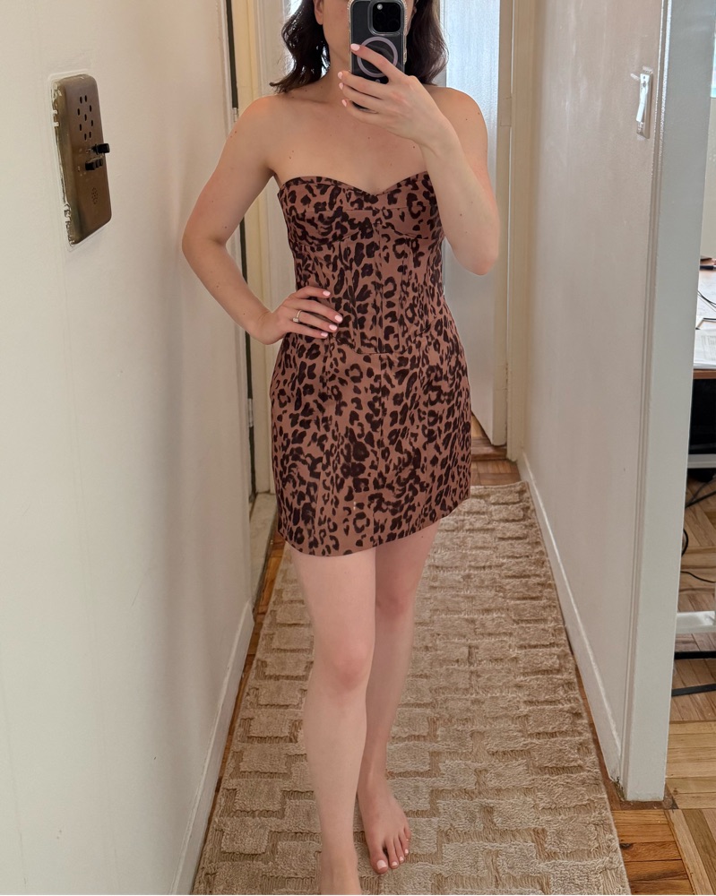 This bold leopard print mini dress exudes confidence and style. It's the perfect party or night-out look. Size 4 pictured at different weights (mirror 8-10 pounds smaller than night out photo).