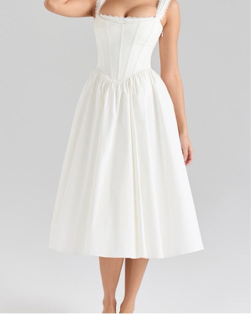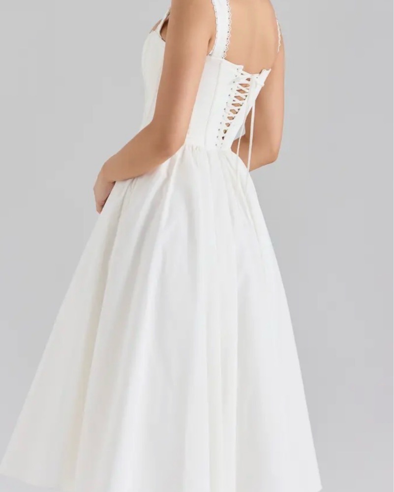 Romantic square-neck lace trim dress with exposed boning on the corset and a tulle lined skirt. The perfect summer engagement, bridal shower or vacation dress! Doesn’t run true to size, I’m a XS/S, and had to size up to M!