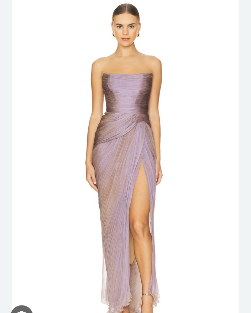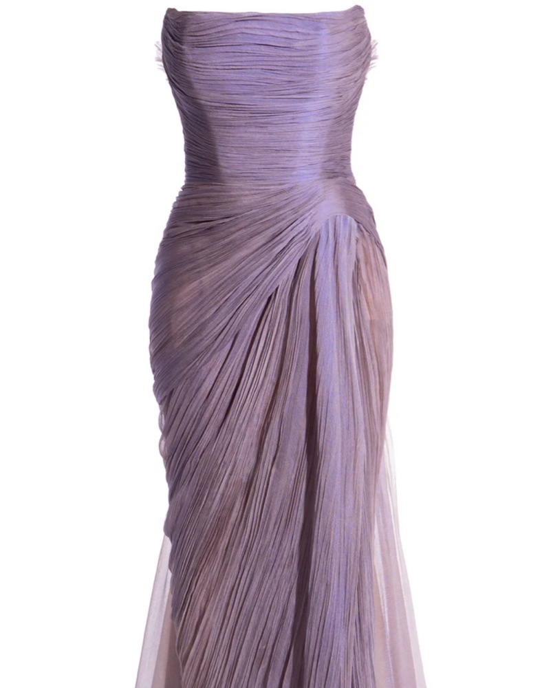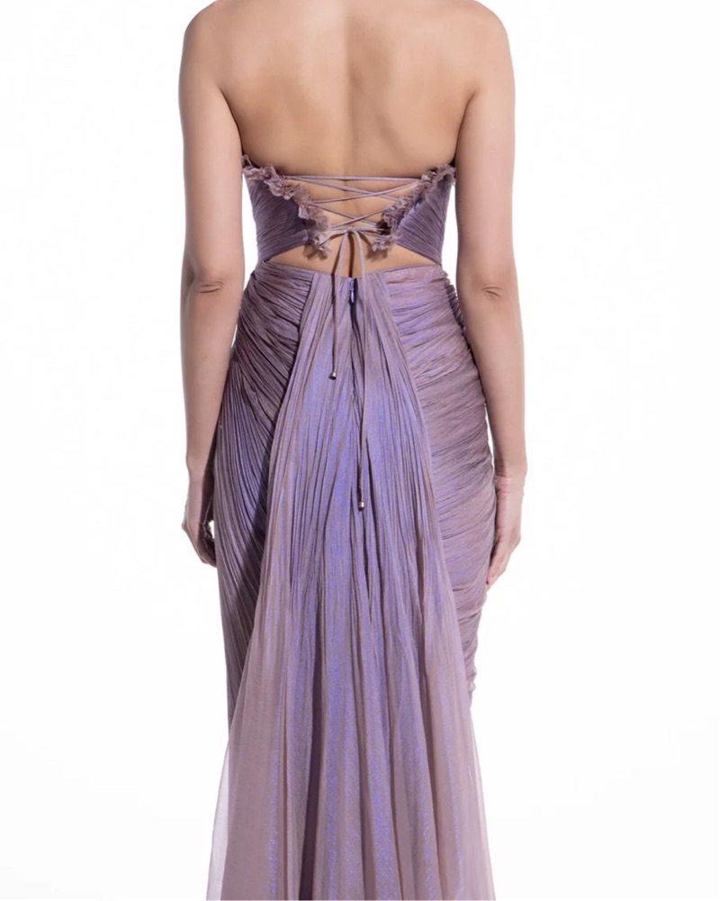 This stunning gown features intricate ruching and a dramatic thigh-high slit, perfect for a formal event or special occasion.