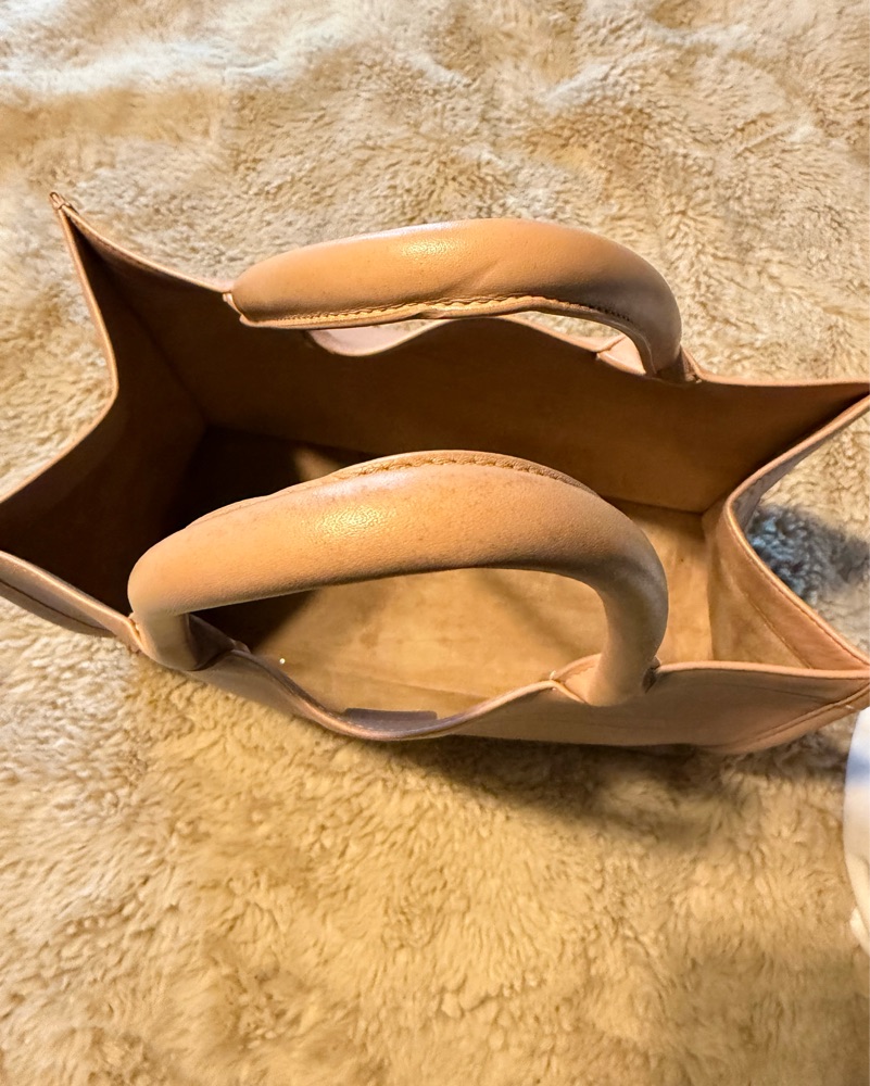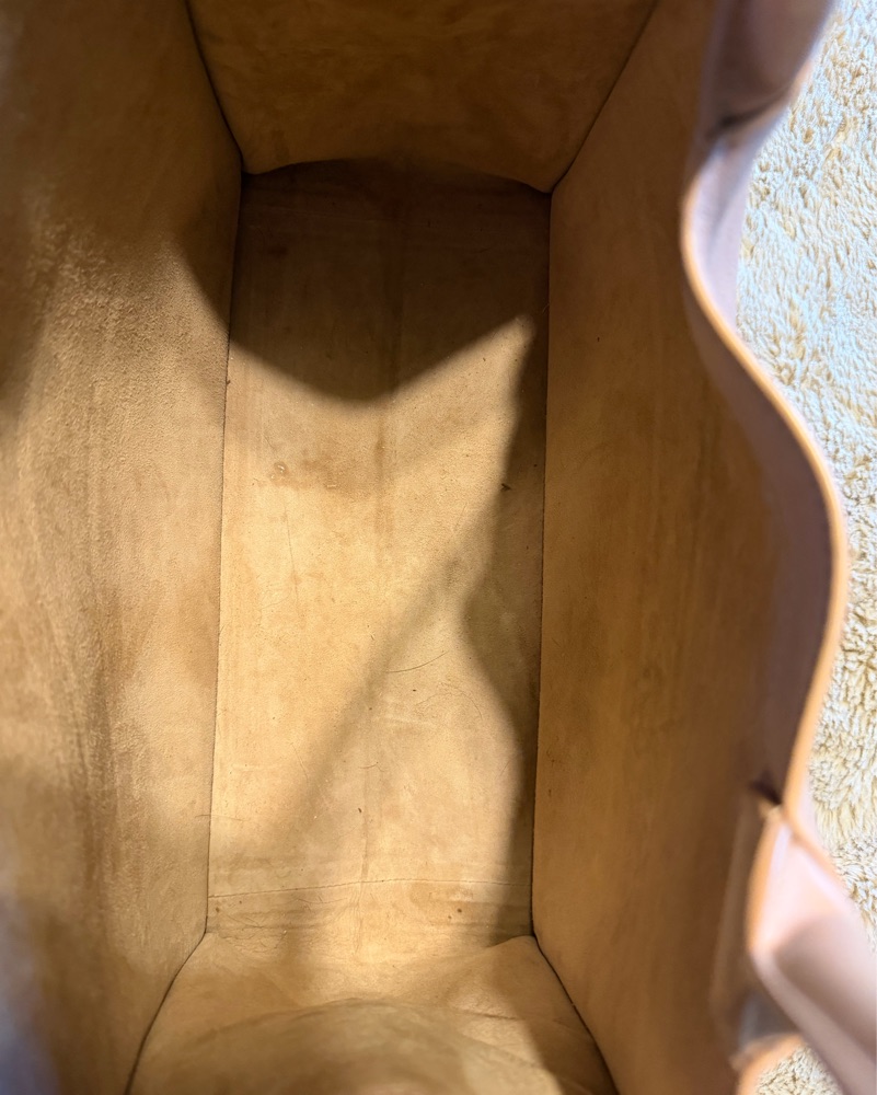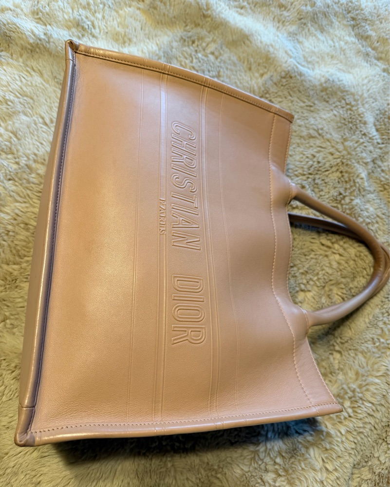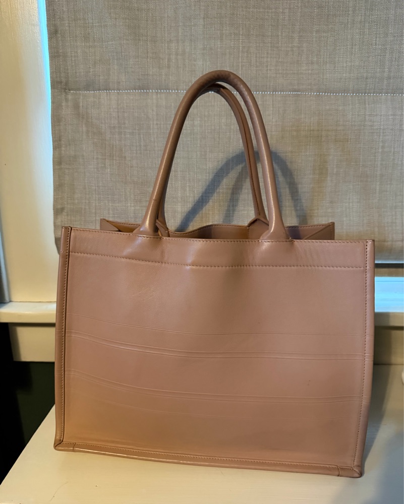 This is an authentic like new CHRISTIAN DIOR Calfskin Embossed Large Book Tote in Rose de Vents (tan/nude color). Crafted with leather rolled top handles with CHRISTIAN DIOR embossed logo and opens to a spacious pink suede interior.