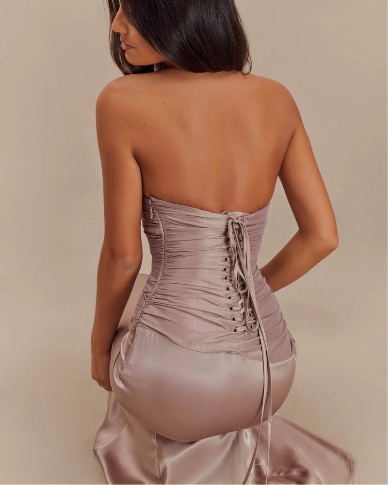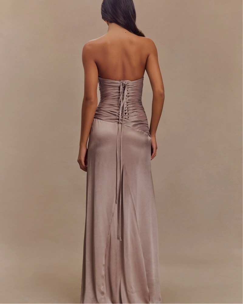 This elegant strapless evening gown features a sophisticated design perfect for special occasions. The dress comes in a beautiful tan color, offering a timeless and versatile look.