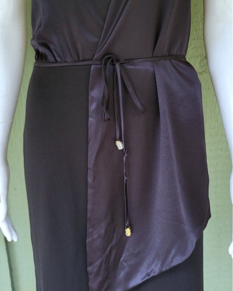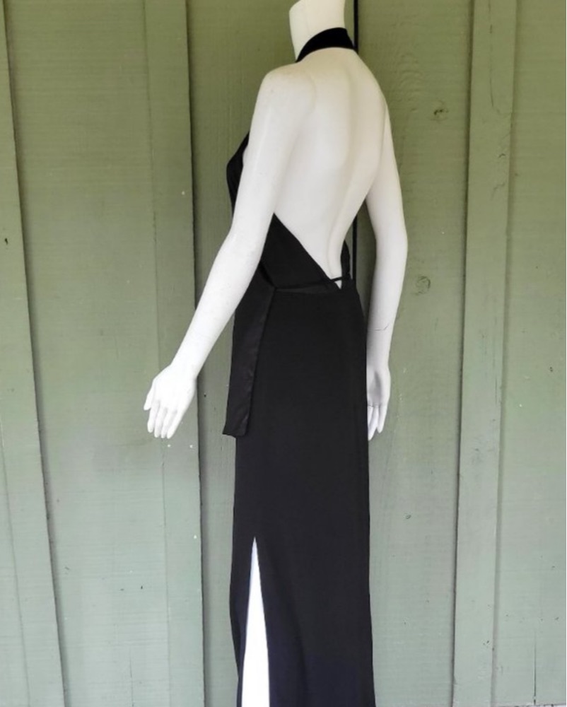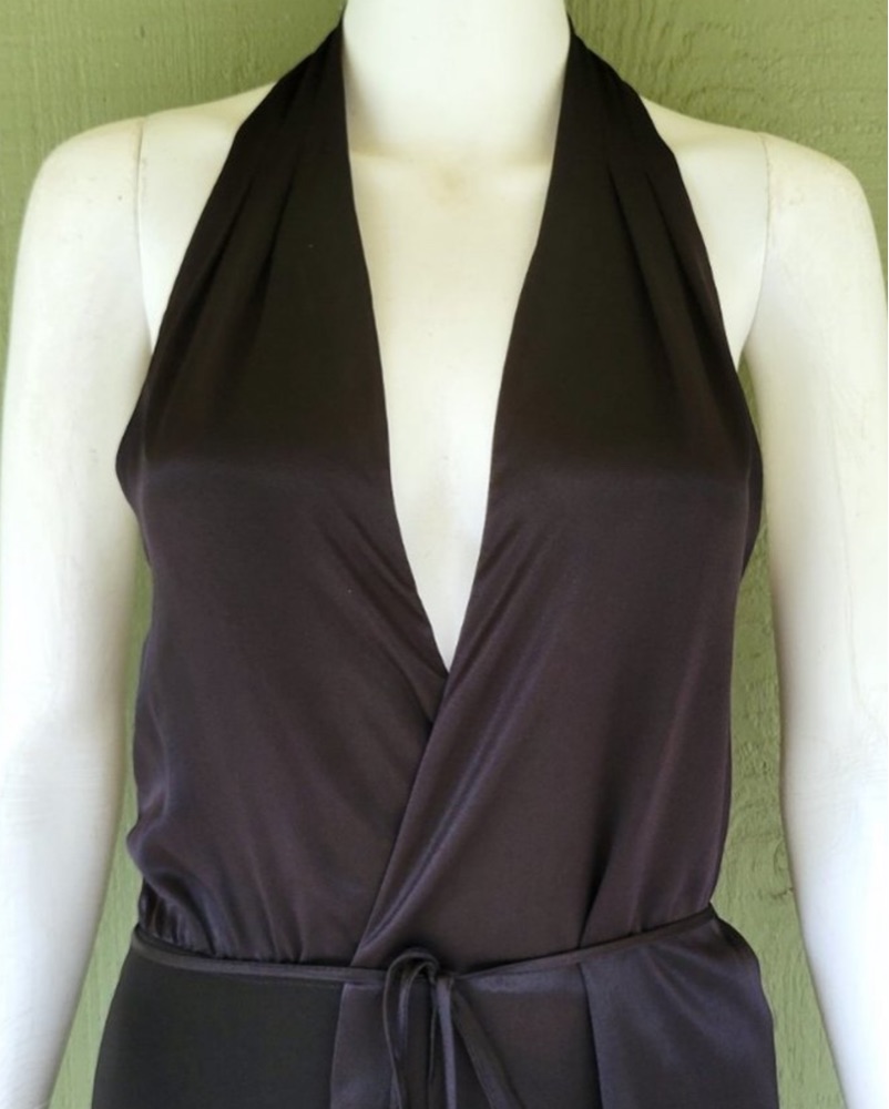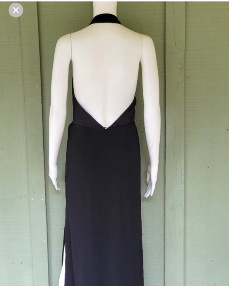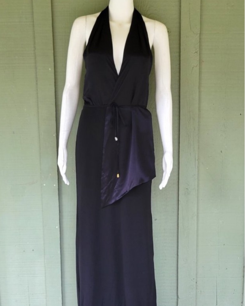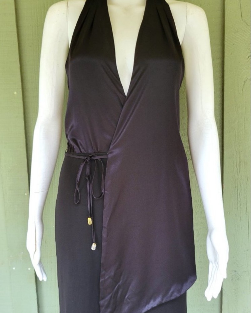 *Vintage* BCBG Max Azria black halter neck evening gown with satin wrap top and side slit. Elevated black dress - super flattering and comfortable.k