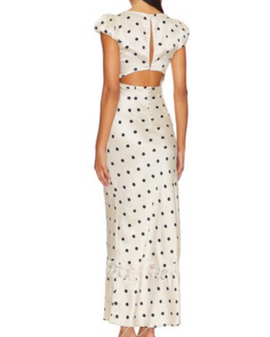 “Butterfly Babe Midi Dress” from Free People. Gorgeous polka dot dress with butterfly lace detailing, only worn twice! I also have it in the black colorway, posted in a separate listing.