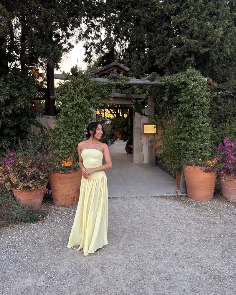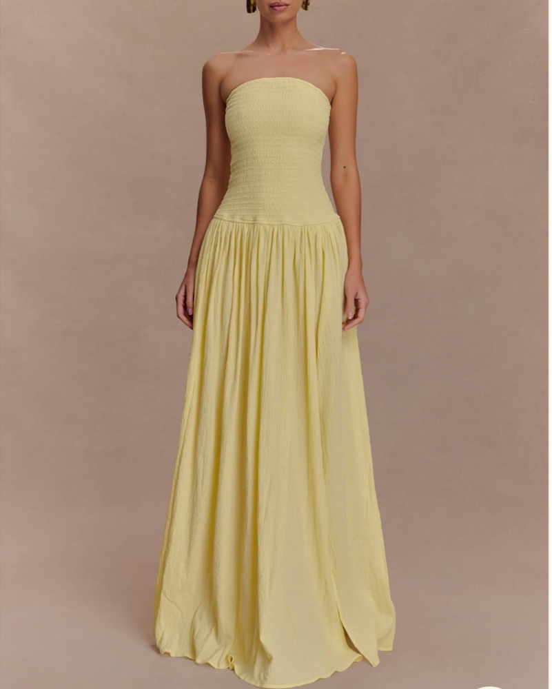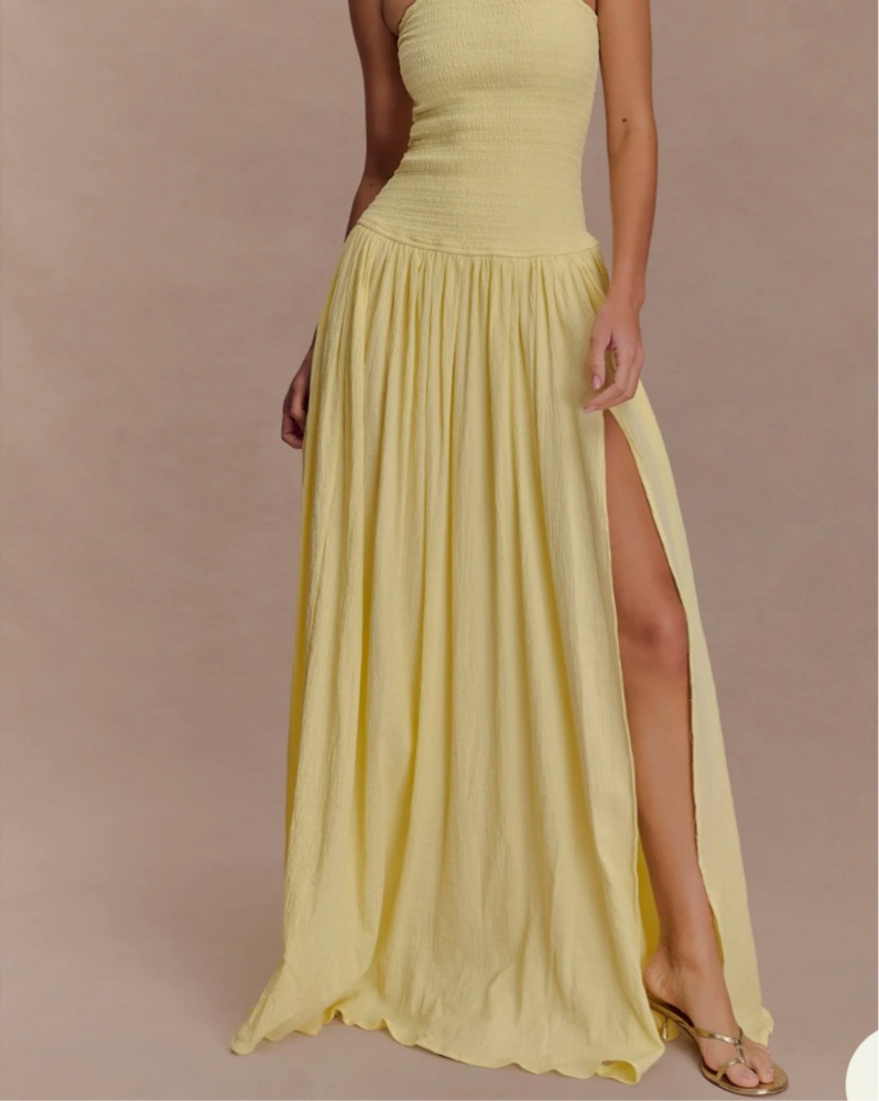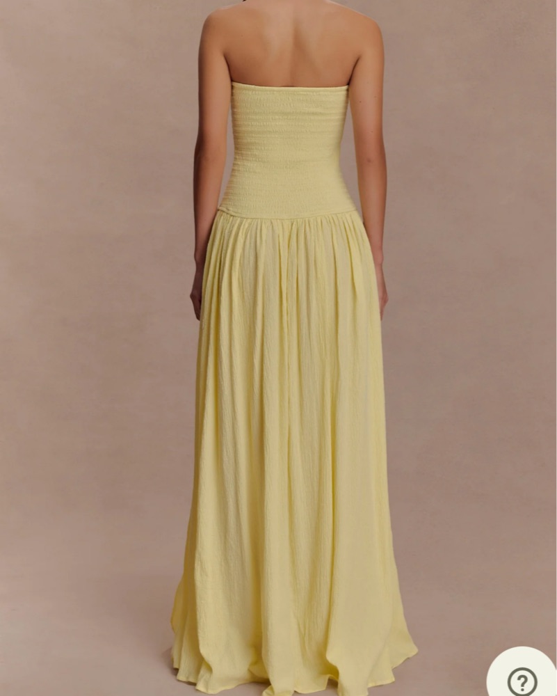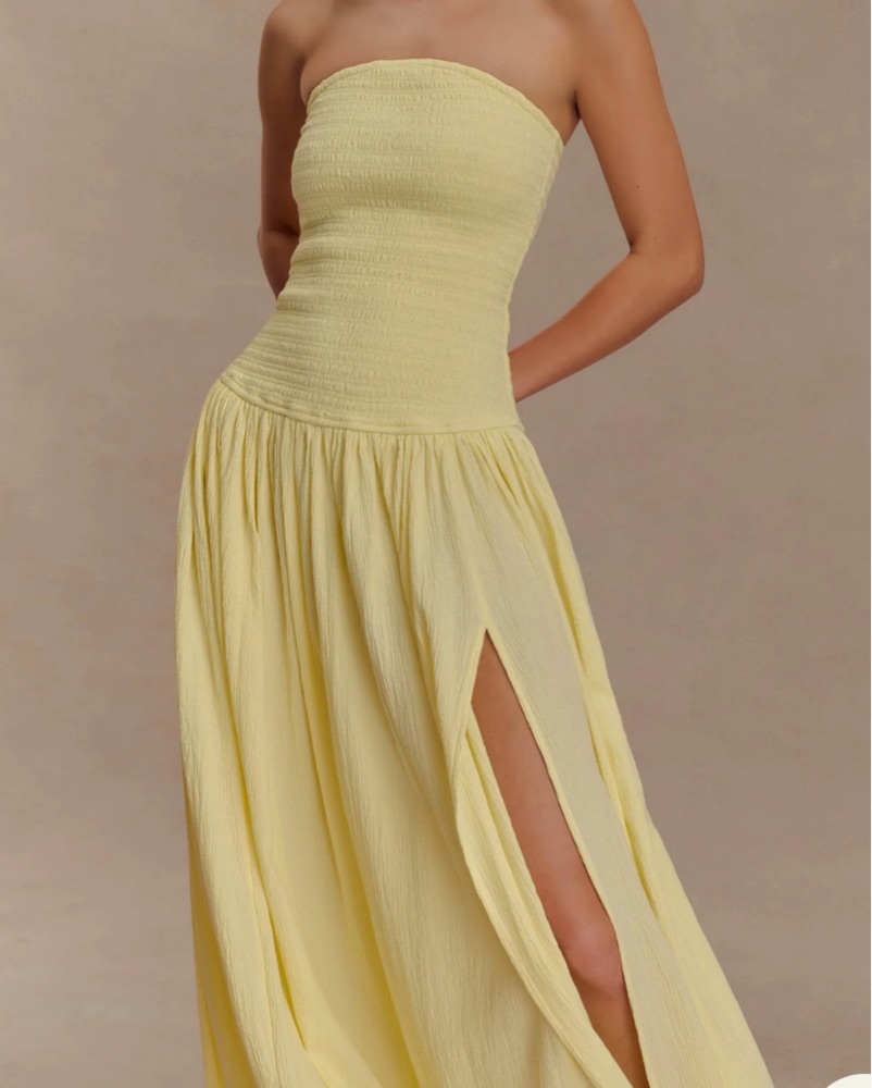 Hemmed and I’m 5’2 The MAUREEN Cotton Shirring Maxi Dress is the epitome of effortless elegance. This strapless dress features a shirred bodice that provides a comfortable and flattering fit, while the longline bodice extends into a beautifully gathered skirt. With a maxi length & subtle leg split