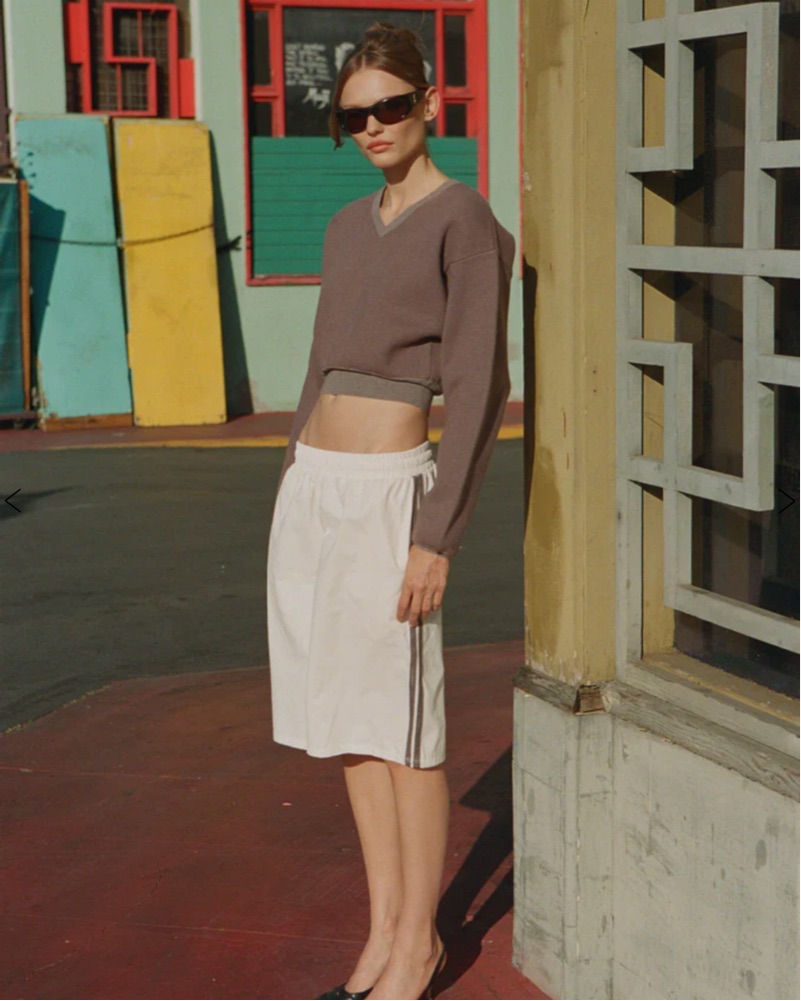 The Romeo Jort is a straight-leg 3/4 pant with an adjustable drawstring waistband and contrast taping along the legs