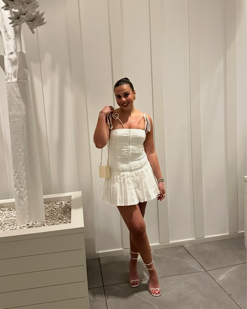 Such a cute white dress for summer. Pleated bottom with corset top and straps tie.