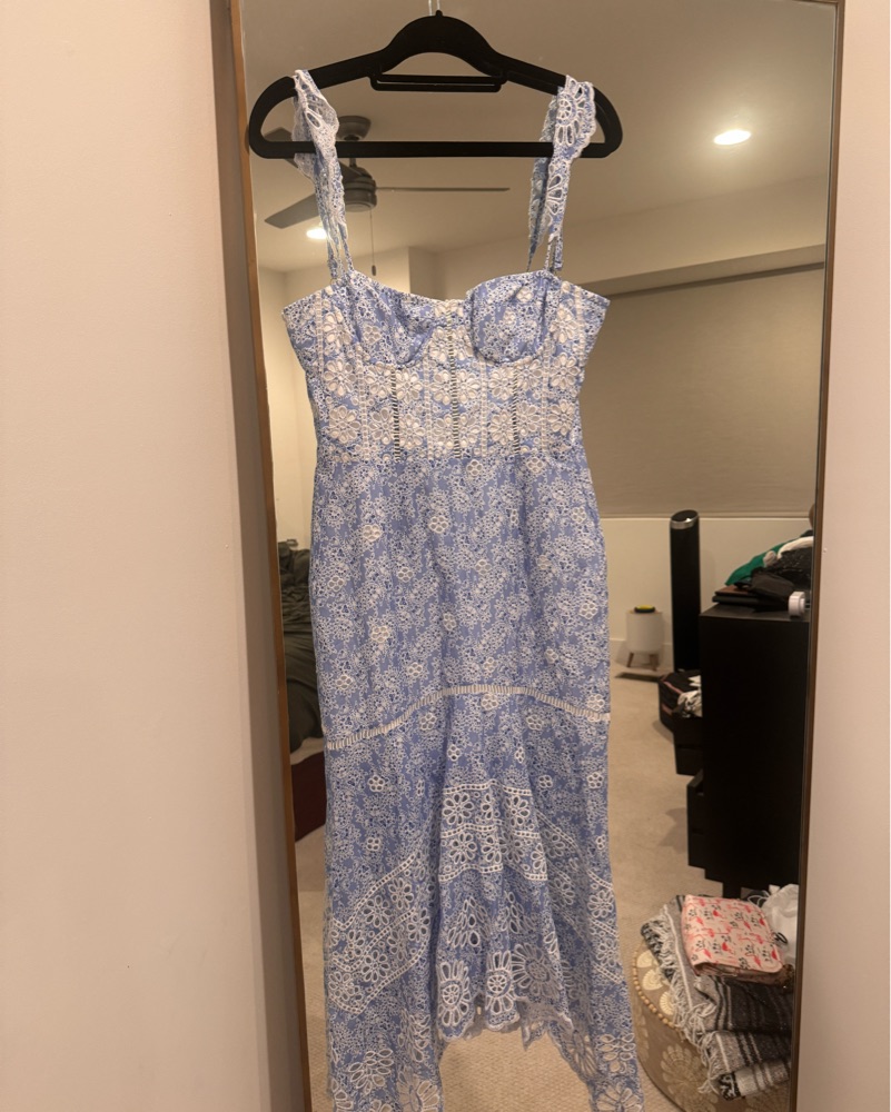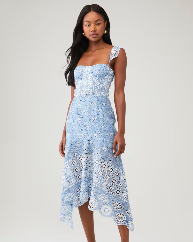 Light blue lace midi dress with a fitted bodice and floral detail. Perfect for brunch, weddings, or summer events.