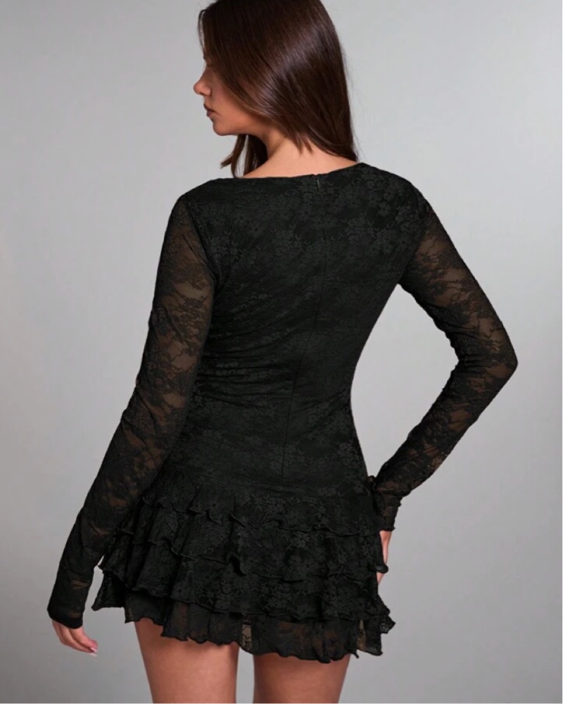 fitted black lace mini dress with long sheer sleeves and a soft ruffle hem. Feminine and flirty, perfect for nights out or dressy occasions.