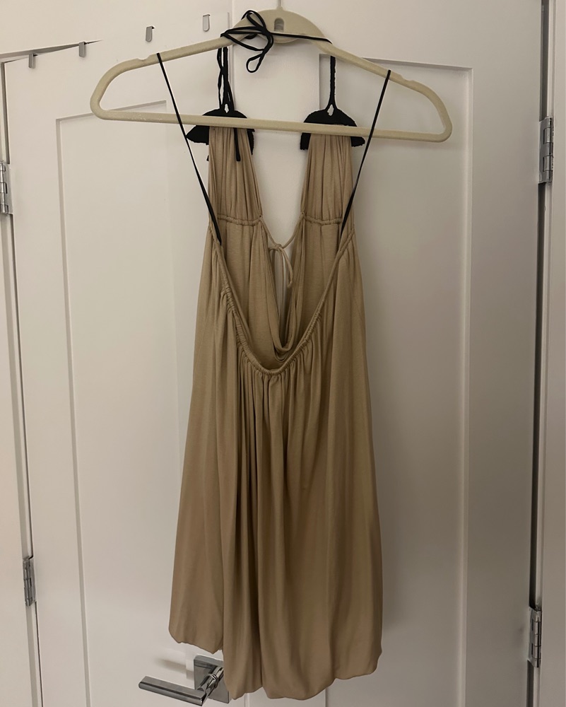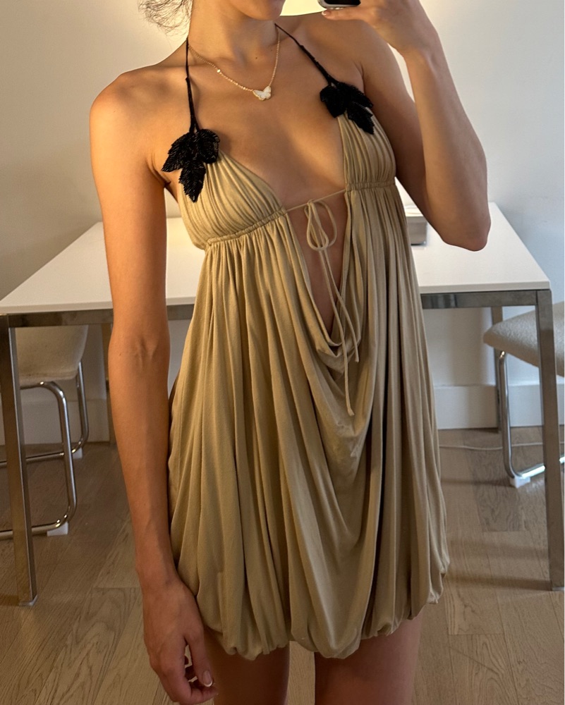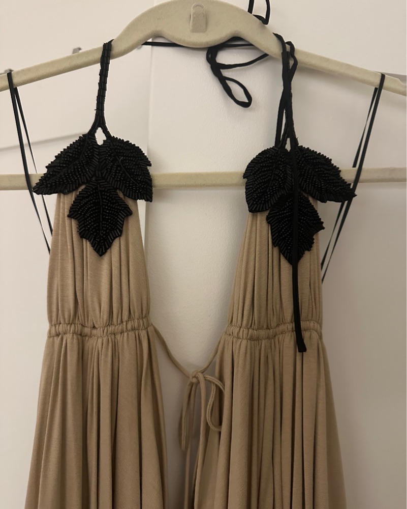 Greek goddess vibesss🧚‍♀️vintage early 00s designer Ingwa Melero draped halter dress with embellished leaves. Adjustable neck and front ties. Size XS (could fit small). I’m 5’7!!