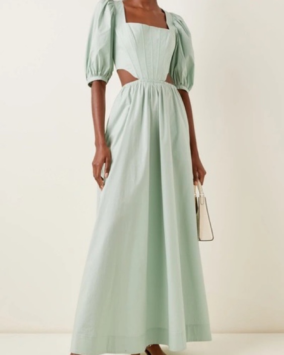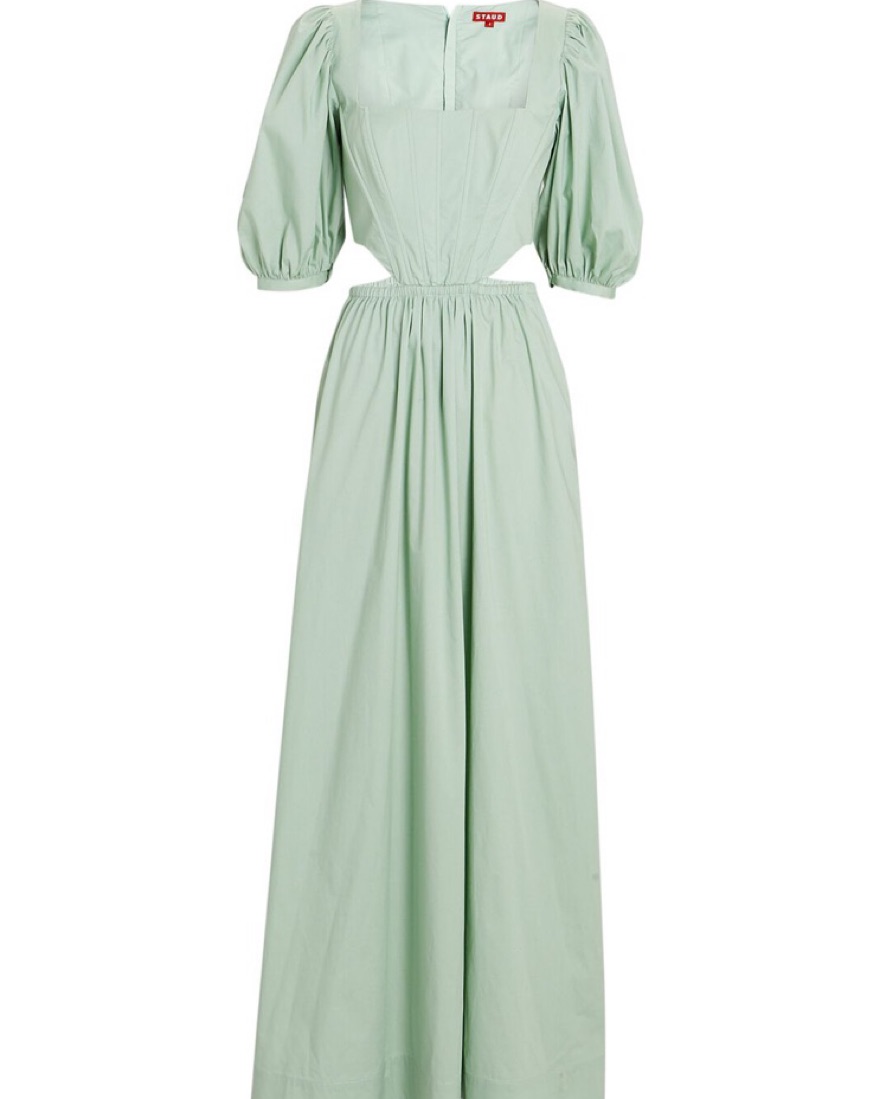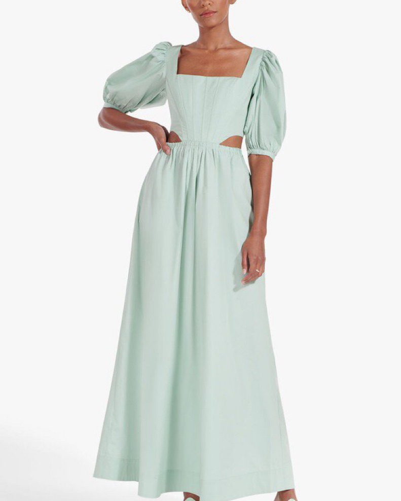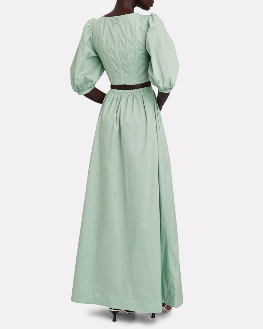 Tailored along a corset-inspired cut-out bodice, the label's Astro dress is set with never fail puff sleeves in stretch cotton poplin. Elasticized cuffs. Hip seam pockets. Back elasticized waistband and zip closure. Interior boning.