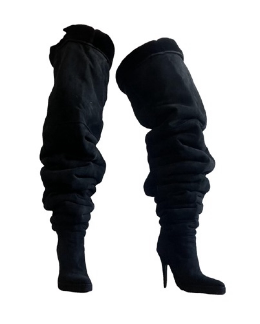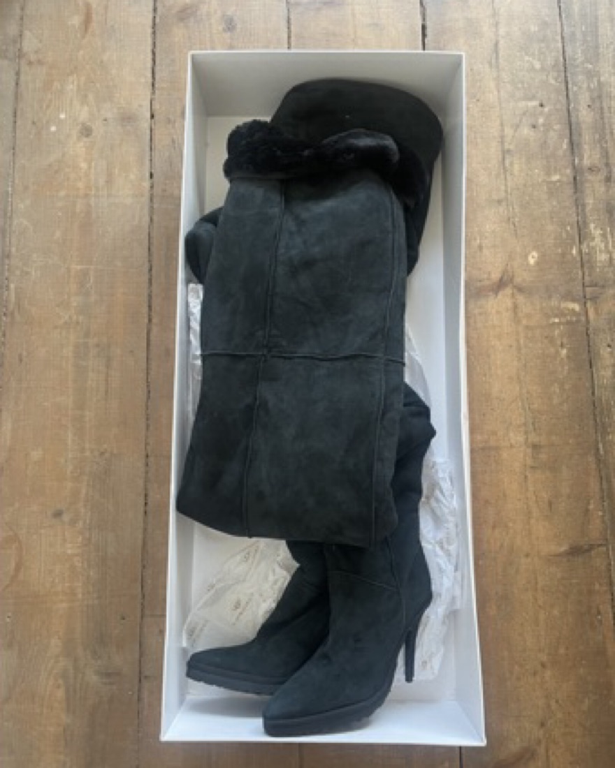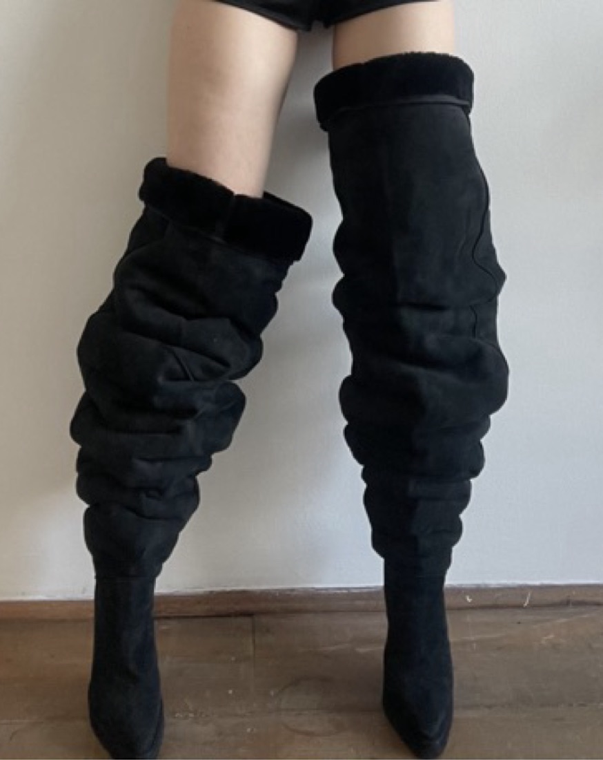 Black suede thigh high boots lined with sheepskin fur. Rare ugg collab
