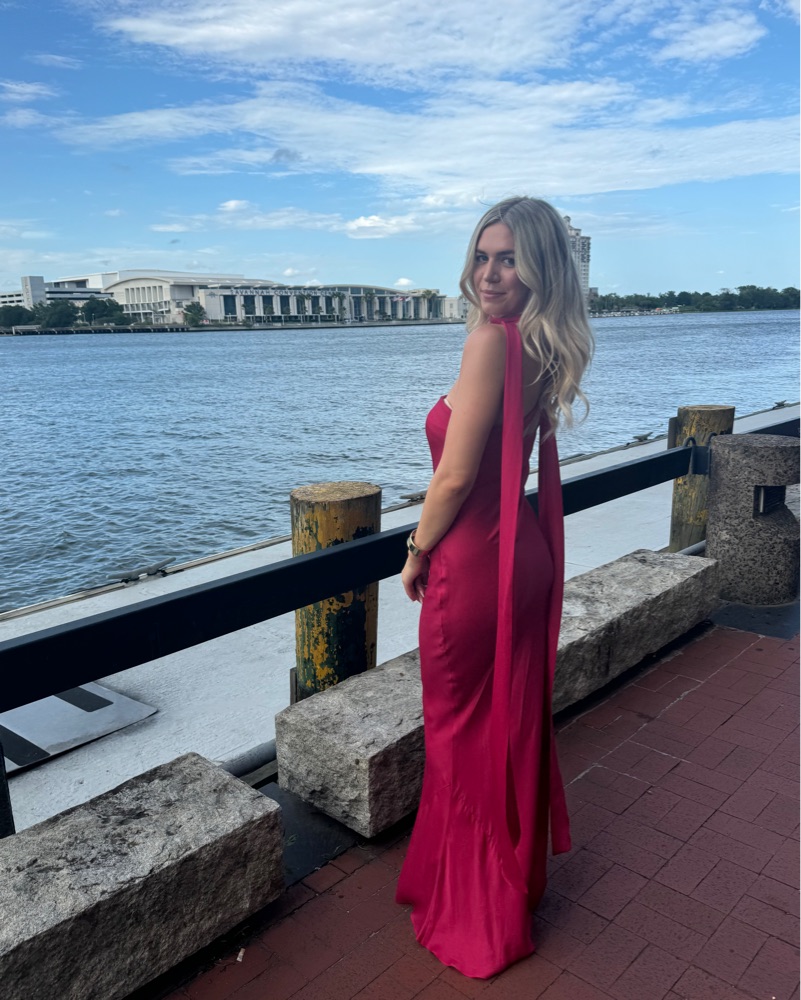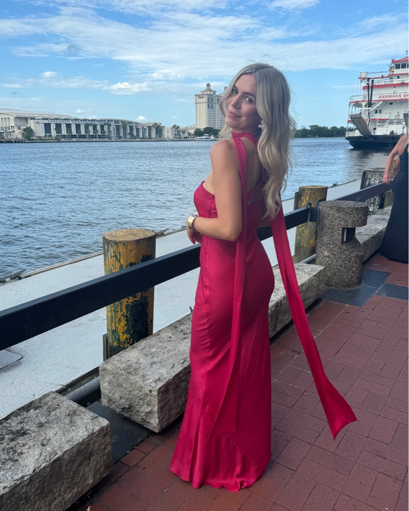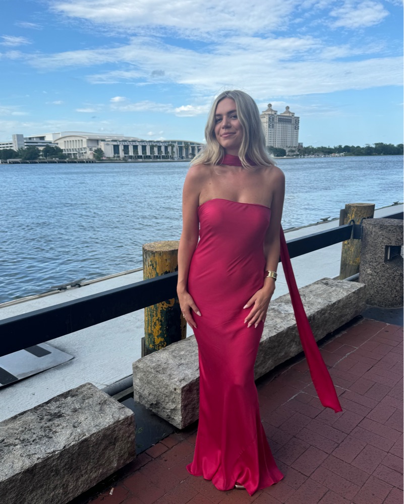Worn once! Strapless cherry pink silk dress with neck tie. Size M but fits like a S