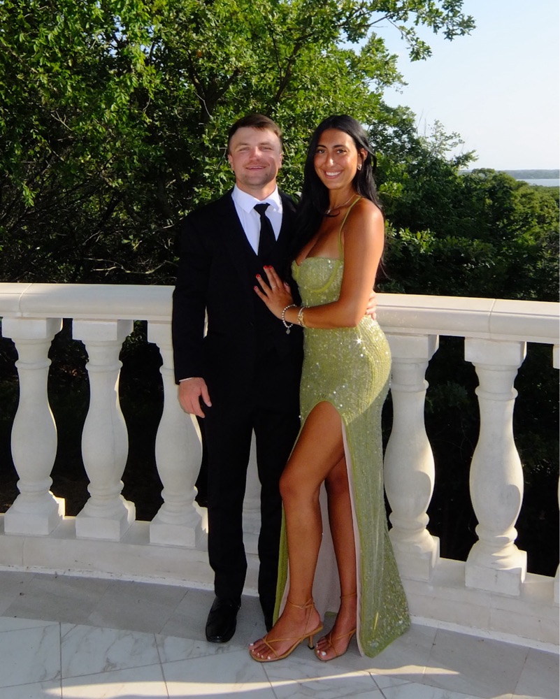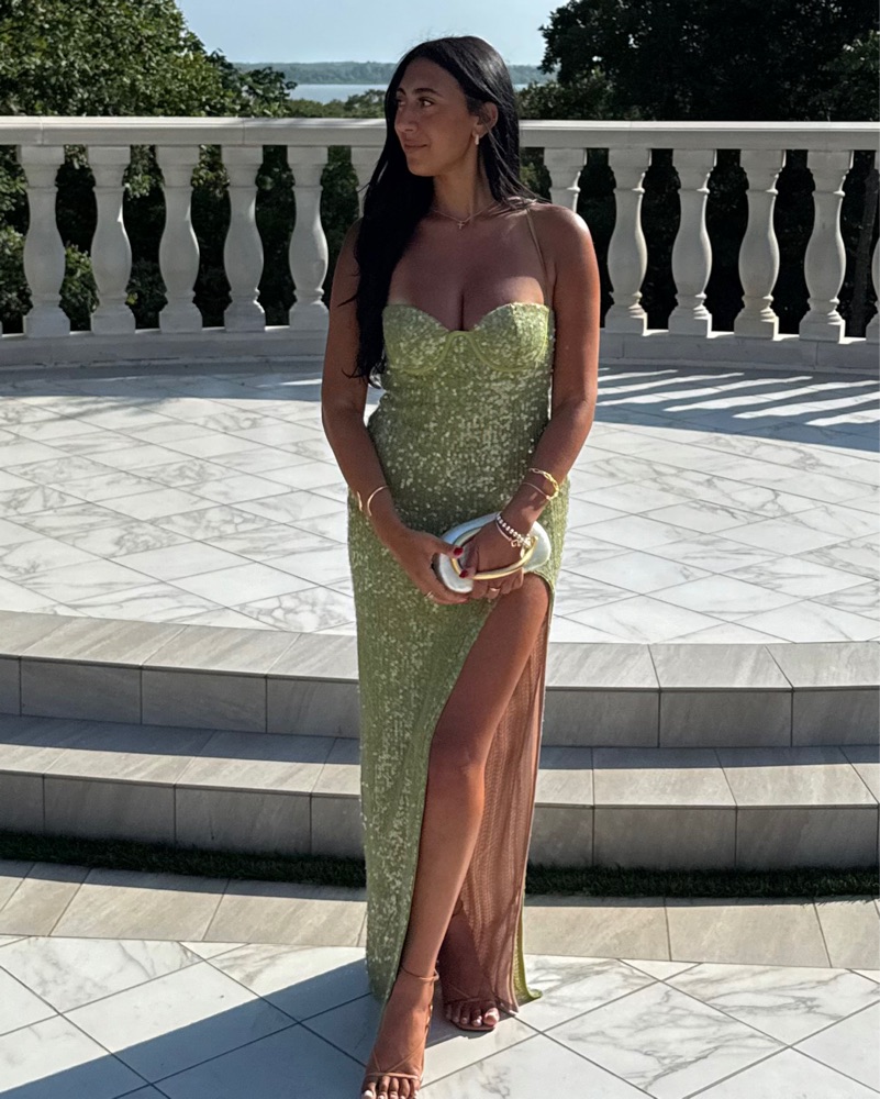 This stunning emerald green sequin gown is perfect for a glamorous event or special night out. The figure-flattering silhouette and high slit add an alluring touch.