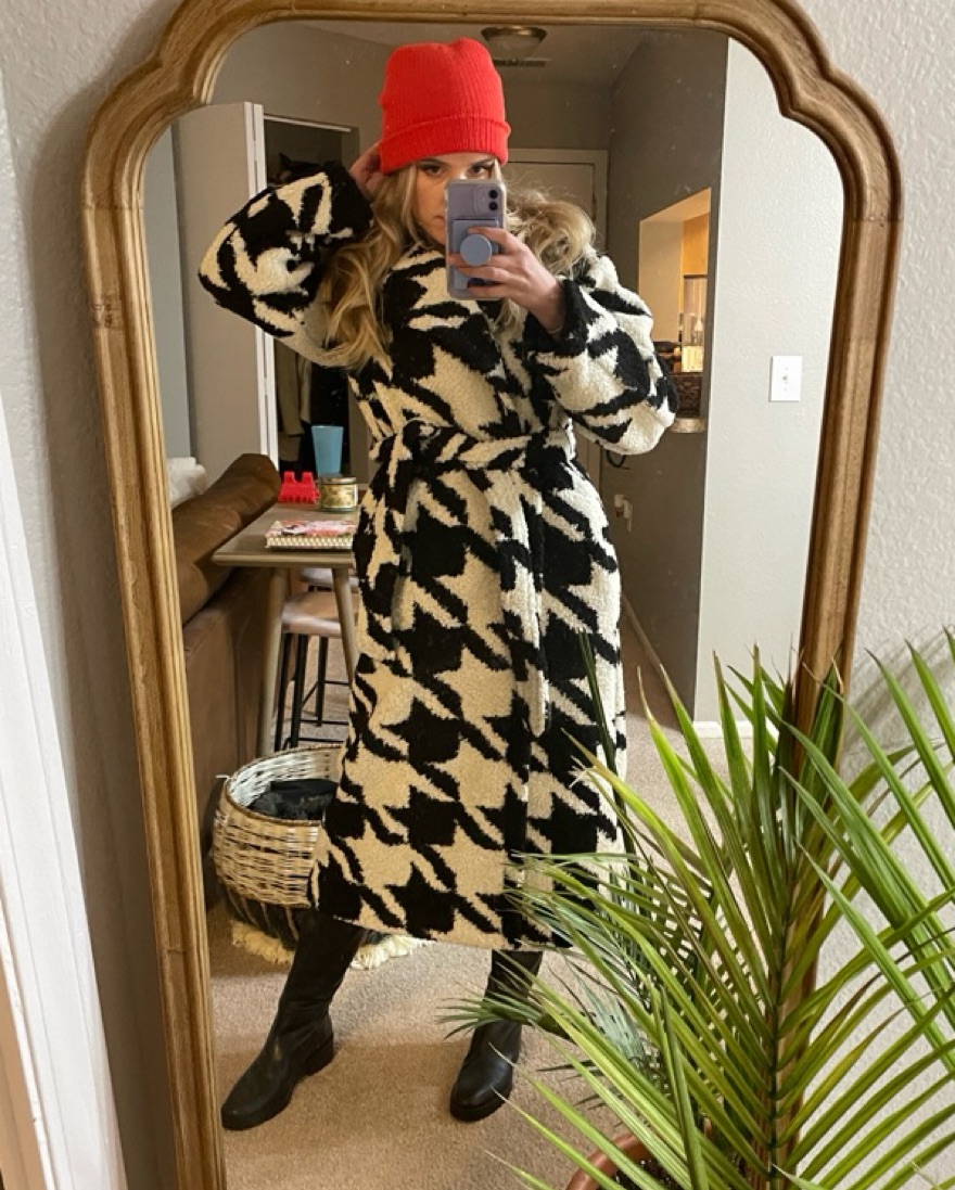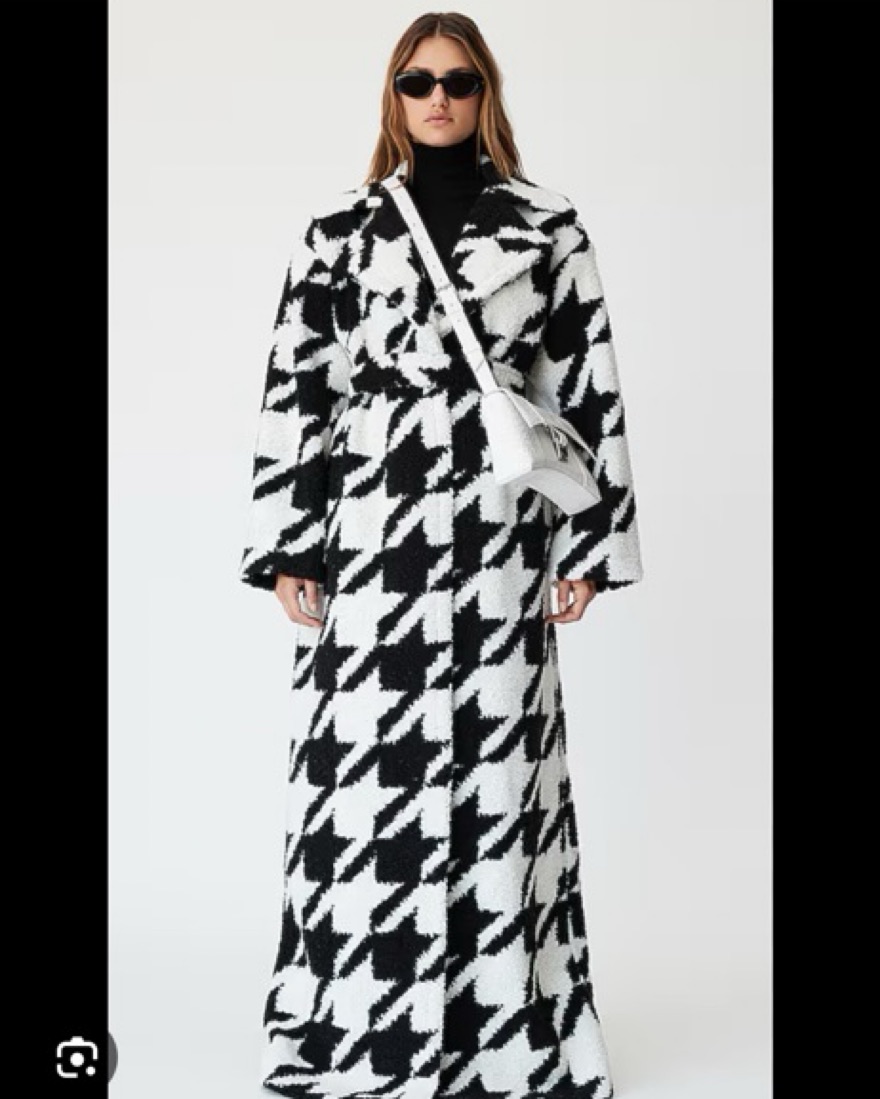 Thick, warm coat, near ankle length. No buttons just tie closure which keeps it very secure.