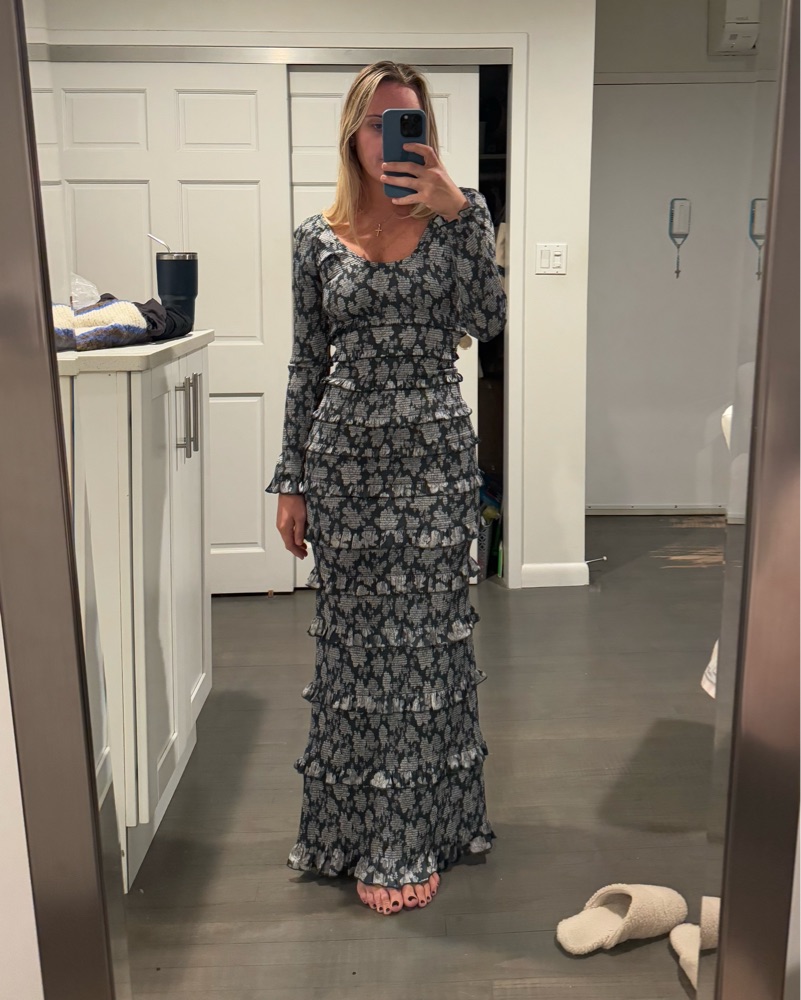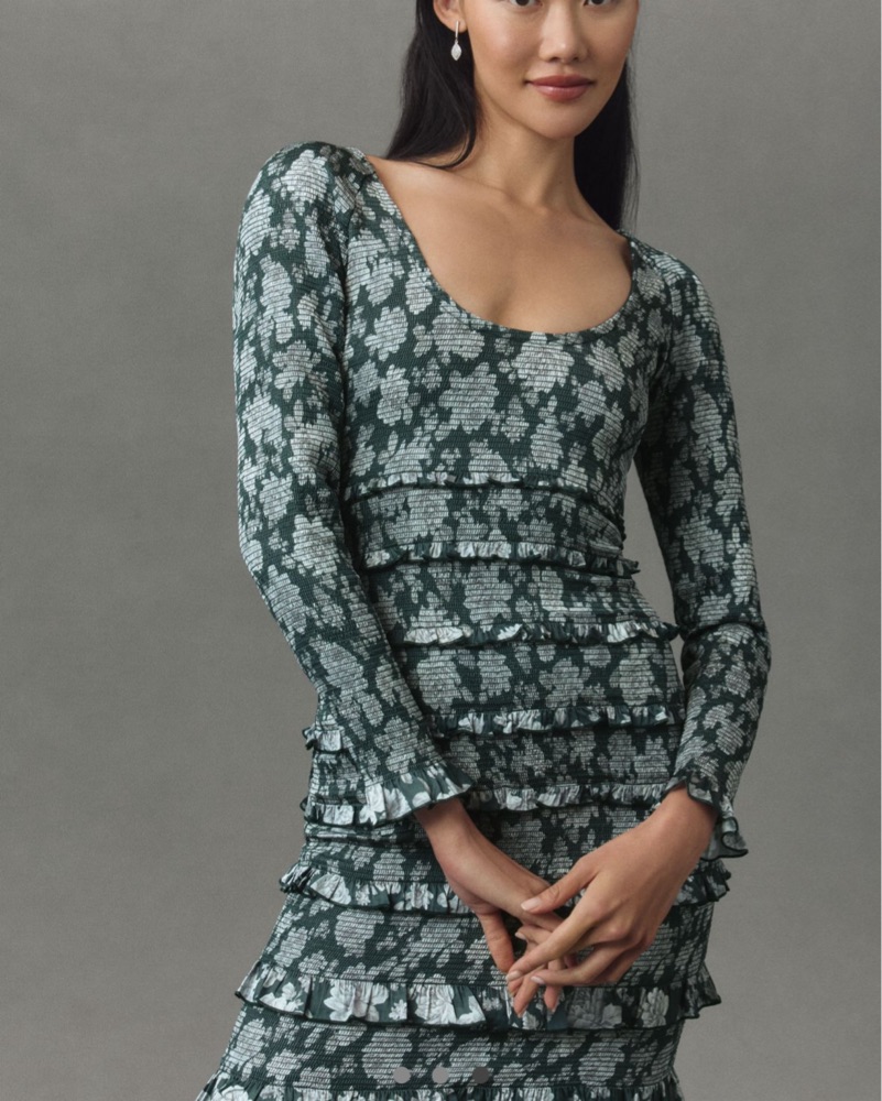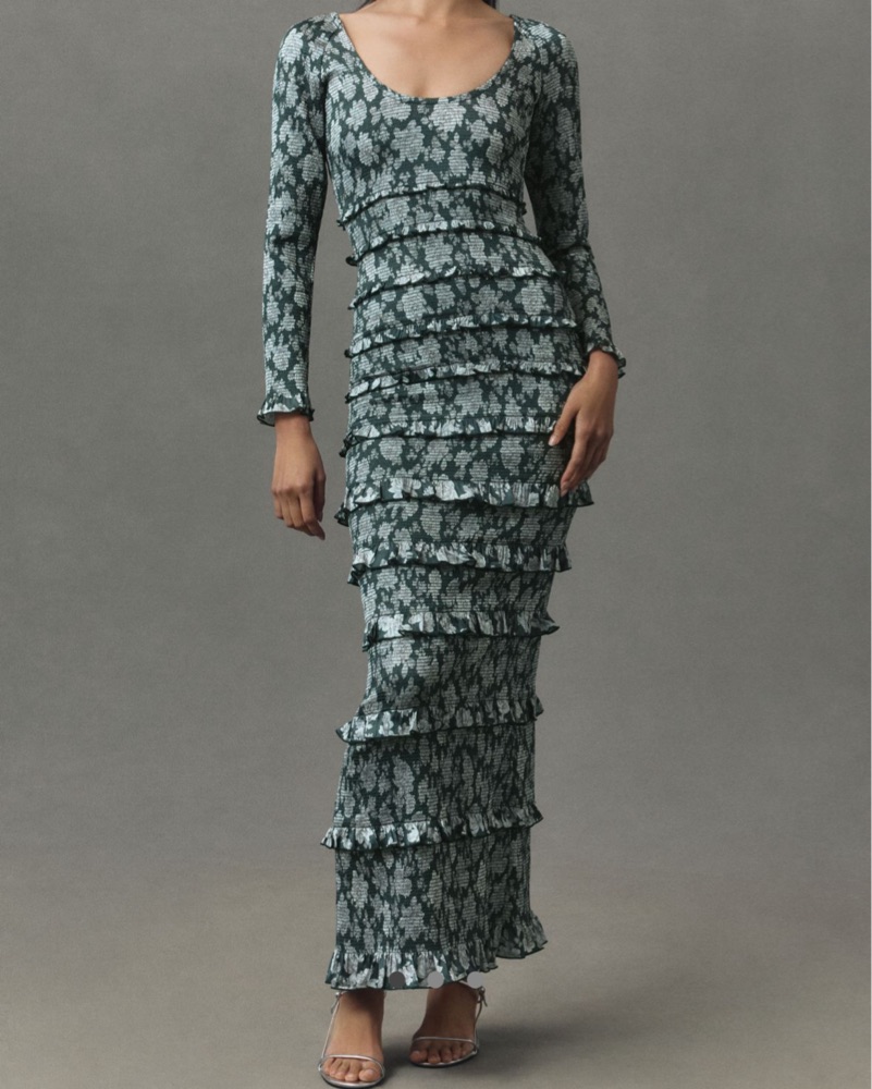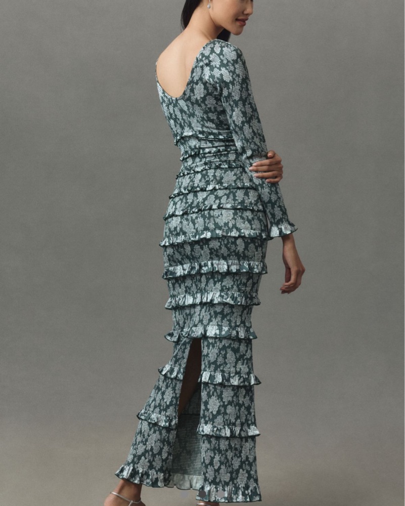 Perfect condition - never worn! The V. Chapman Lanie Long-Sleeve Scoop-Neck Maxi Dress features a stretchy satin fabric that molds to your curves, with ruched detailing and ruffles, all in a beautiful emerald peony print.
