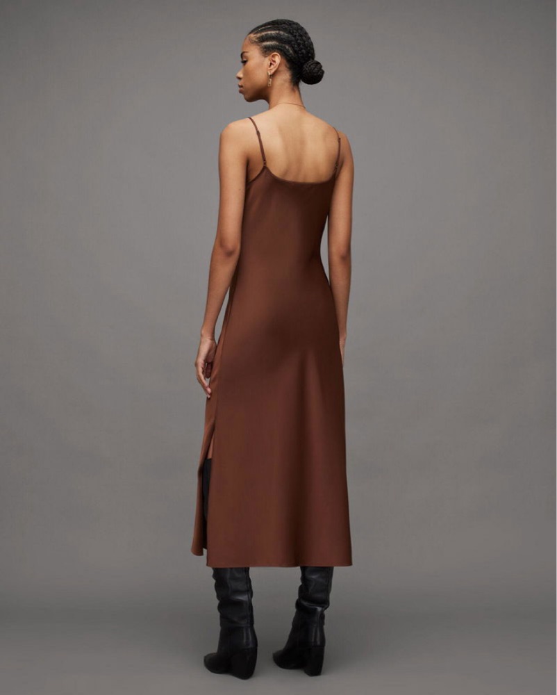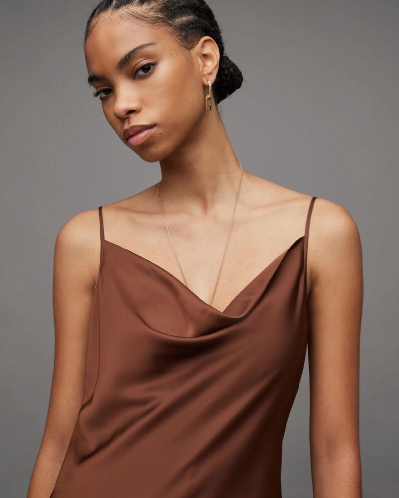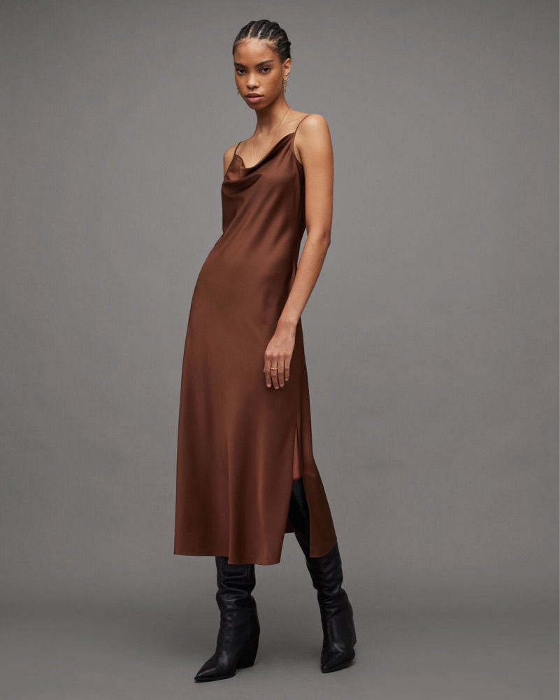 AllSaints Hadley Cowl Neck Satin Midi Slip Dress in brown. Like-new condition. Size 6. True to size, with adjustable straps. I’m 5’3, ~110 lbs, but dress was very roomy on me and fit more like a maxi dress.