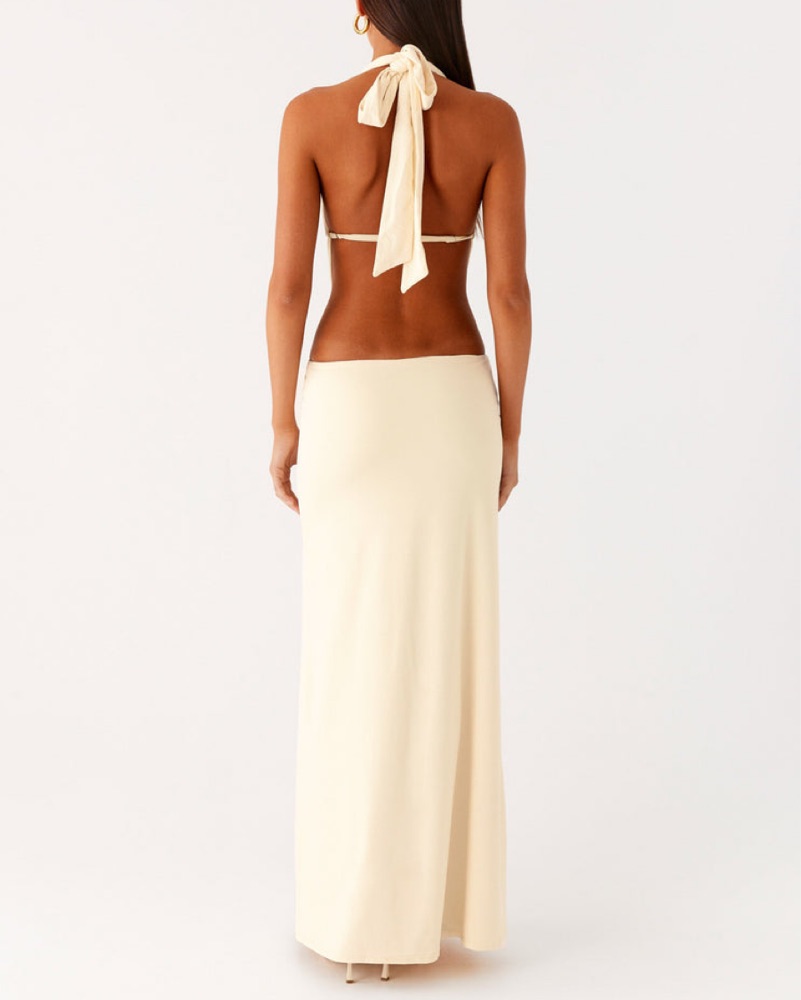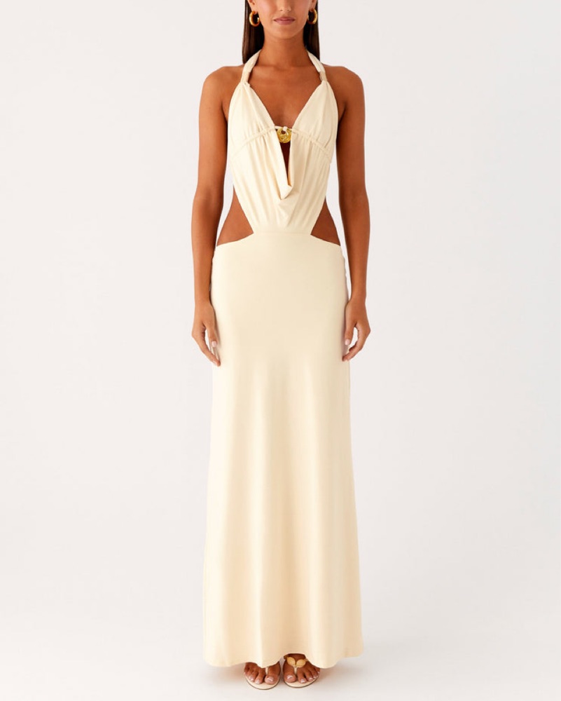 This stunning halter gown is a timeless choice for a formal occasion. The flowing, floor-length silhouette and chic open back make it a showstopping piece.