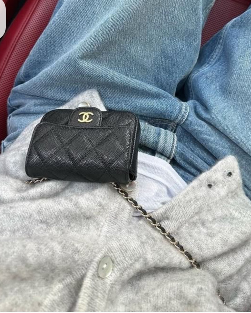 Chanel mini bag in black caviar leather with gold-tone chain. Can be worn crossbody or styled as a belt bag. Compact yet statement-making, perfect for evenings, events, or hands-free chic city looks. Timeless and versatile. Wallet sized.